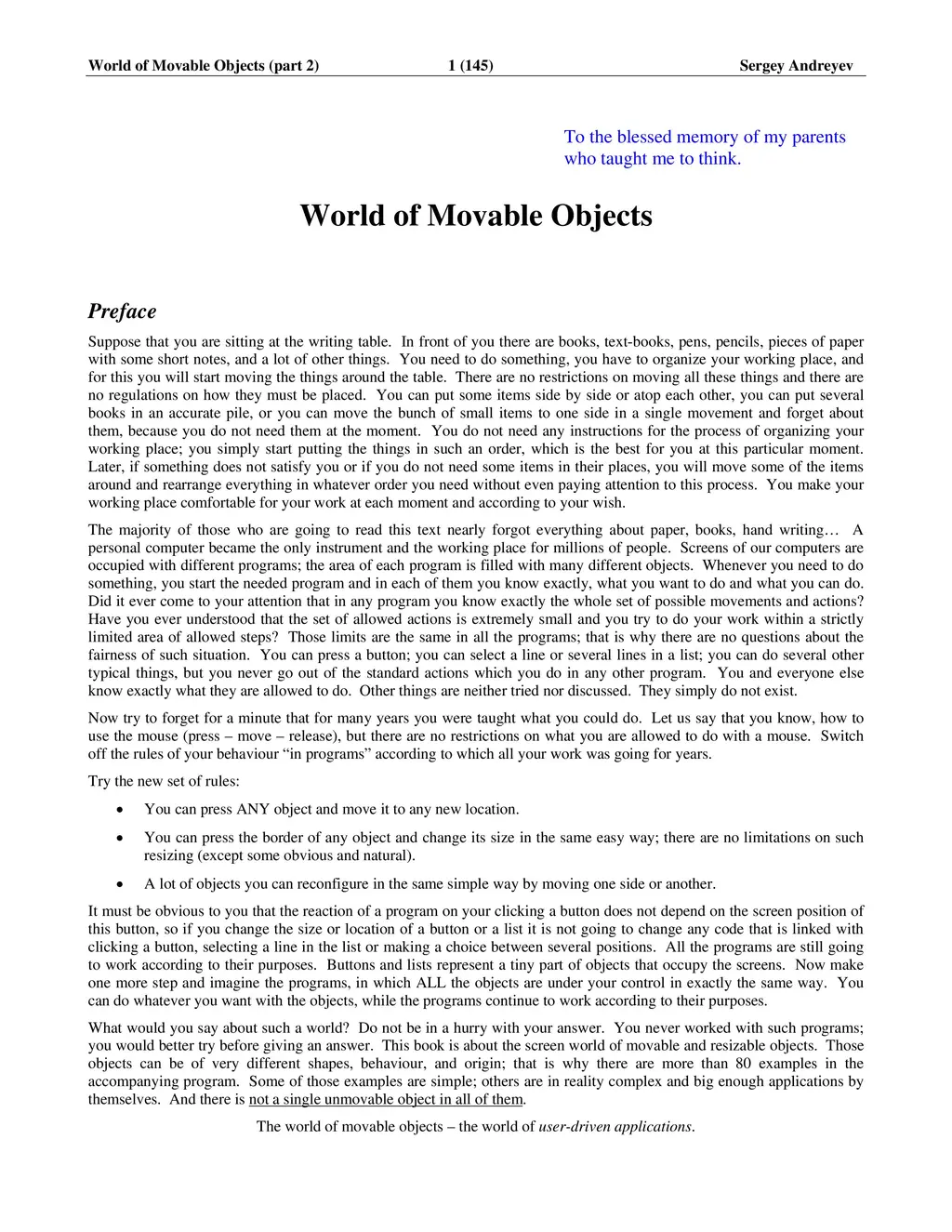 This book is about the transformation of screen objects into movable and resizable and about the design of applications entirely on the basis of such elements. The screen objects have a wide variety of shapes; they can be either graphical objects or controls; there are solitary objects and very complex objects parts of which are involved in individual, synchronous, and related movements. Objects can be involved in forward movements and rotation; they can be resized and reconfigured; all these movements and situations are considered. On the basis of total movability, the new type of programs -- user-driven applications -- are designed. These applications continue to work according to their main purposes, but the whole control of what, when, and how must appear on the screen is passed from designers to users. Due to the size restriction used on CoRR, the book is divided here into two parts and one appendix is deleted. At www.sourceforge.net in the project MoveableGraphics the whole book is available in a single file together with the accompanying application with all its source codes.