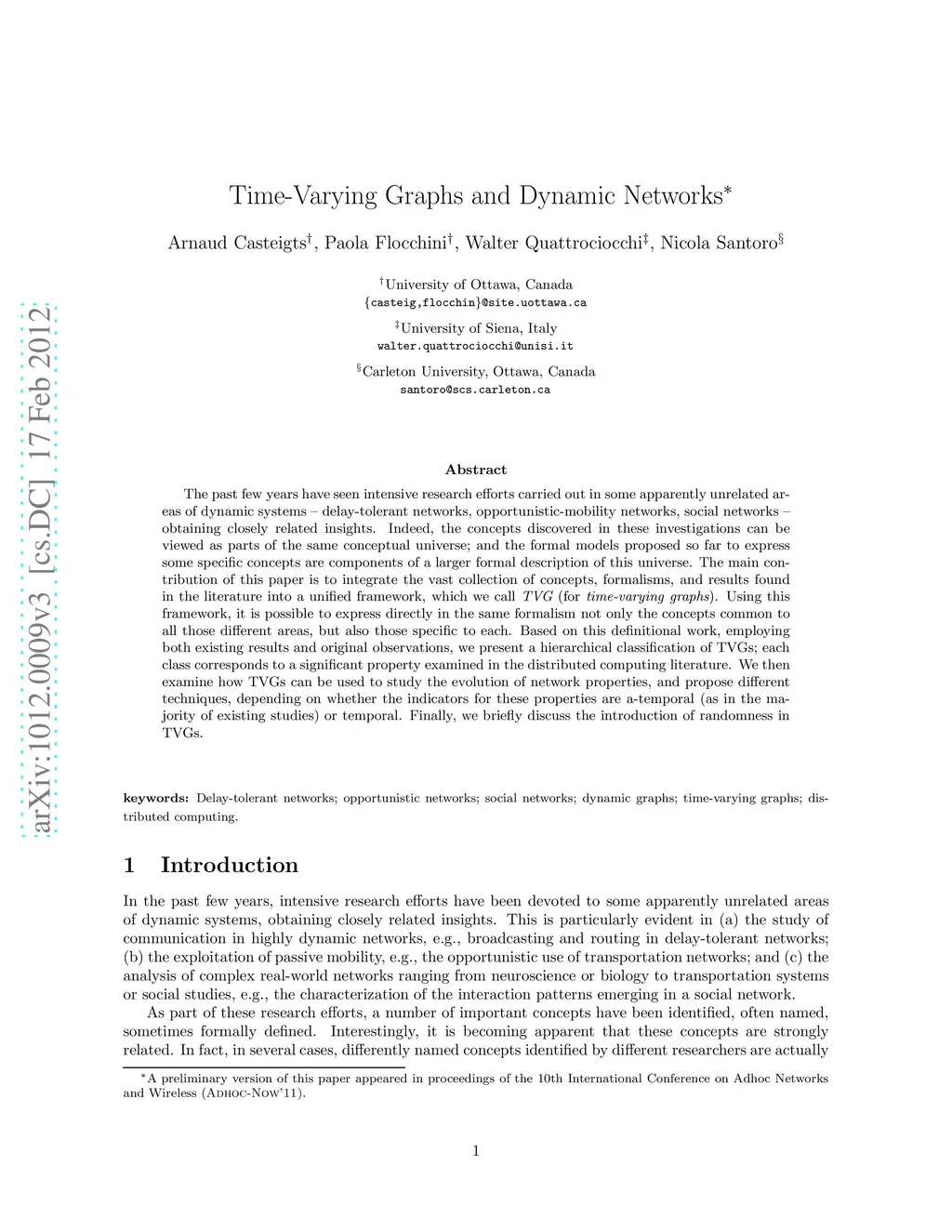 The past few years have seen intensive research efforts carried out in some apparently unrelated areas of dynamic systems -- delay-tolerant networks, opportunistic-mobility networks, social networks -- obtaining closely related insights. Indeed, the concepts discovered in these investigations can be viewed as parts of the same conceptual universe; and the formal models proposed so far to express some specific concepts are components of a larger formal description of this universe. The main contribution of this paper is to integrate the vast collection of concepts, formalisms, and results found in the literature into a unified framework, which we call TVG (for time-varying graphs). Using this framework, it is possible to express directly in the same formalism not only the concepts common to all those different areas, but also those specific to each. Based on this definitional work, employing both existing results and original observations, we present a hierarchical classification of TVGs; each class corresponds to a significant property examined in the distributed computing literature. We then examine how TVGs can be used to study the evolution of network properties, and propose different techniques, depending on whether the indicators for these properties are a-temporal (as in the majority of existing studies) or temporal. Finally, we briefly discuss the introduction of randomness in TVGs.