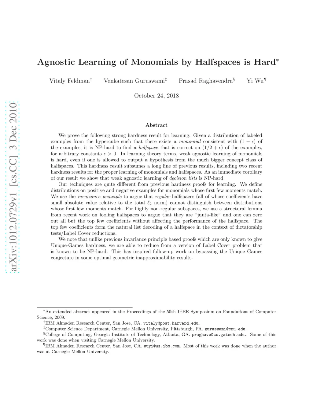 We prove the following strong hardness result for learning: Given a distribution of labeled examples from the hypercube such that there exists a monomial consistent with of the examples, it is NP-hard to find a halfspace that is correct on of the examples, for arbitrary constants . In learning theory terms, weak agnostic learning of monomials is hard, even if one is allowed to output a hypothesis from the much bigger concept class of halfspaces. This hardness result subsumes a long line of previous results, including two recent hardness results for the proper learning of monomials and halfspaces. As an immediate corollary of our result we show that weak agnostic learning of decision lists is NP-hard. Our techniques are quite different from previous hardness proofs for learning. We define distributions on positive and negative examples for monomials whose first few moments match. We use the invariance principle to argue that regular halfspaces (all of whose coefficients have small absolute value relative to the total norm) cannot distinguish between distributions whose first few moments match. For highly non-regular subspaces, we use a structural lemma from recent work on fooling halfspaces to argue that they are ``junta-like'' and one can zero out all but the top few coefficients without affecting the performance of the halfspace. The top few coefficients form the natural list decoding of a halfspace in the context of dictatorship tests/Label Cover reductions. We note that unlike previous invariance principle based proofs which are only known to give Unique-Games hardness, we are able to reduce from a version of Label Cover problem that is known to be NP-hard. This has inspired follow-up work on bypassing the Unique Games conjecture in some optimal geometric inapproximability results.