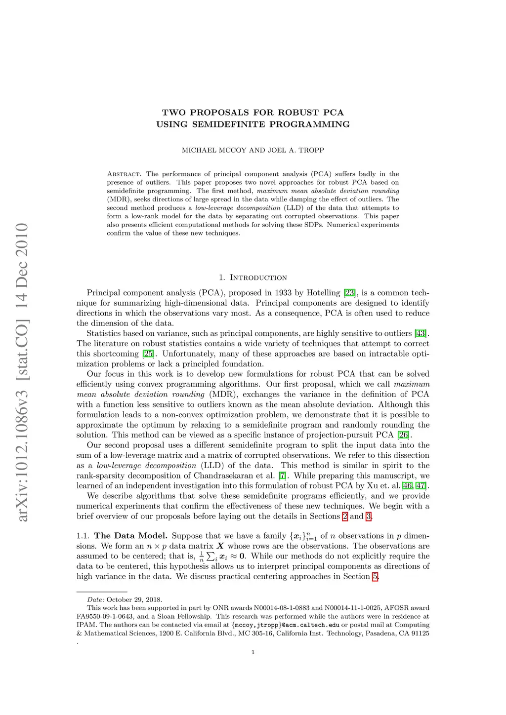 The performance of principal component analysis (PCA) suffers badly in the presence of outliers. This paper proposes two novel approaches for robust PCA based on semidefinite programming. The first method, maximum mean absolute deviation rounding (MDR), seeks directions of large spread in the data while damping the effect of outliers. The second method produces a low-leverage decomposition (LLD) of the data that attempts to form a low-rank model for the data by separating out corrupted observations. This paper also presents efficient computational methods for solving these SDPs. Numerical experiments confirm the value of these new techniques.