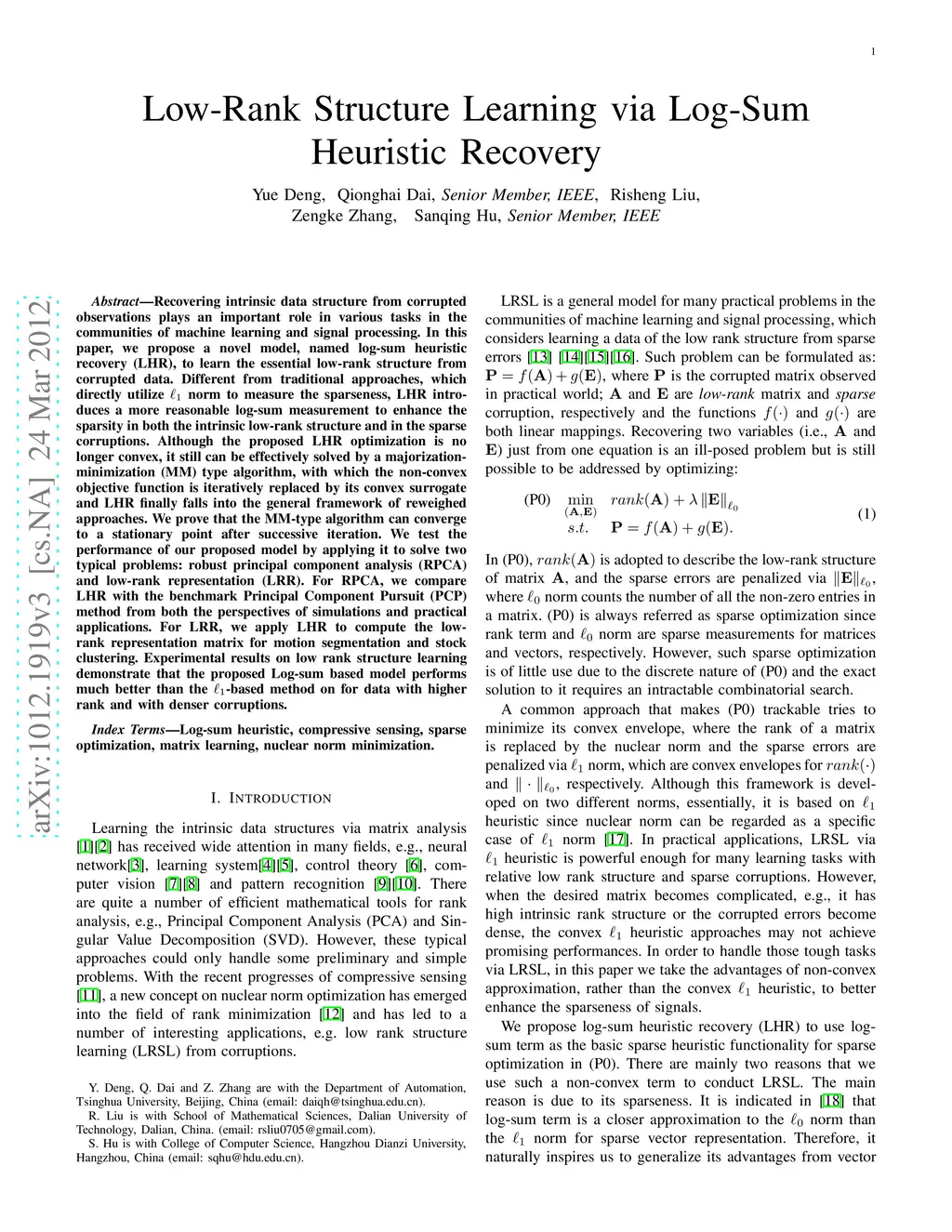 Recovering intrinsic data structure from corrupted observations plays an important role in various tasks in the communities of machine learning and signal processing. In this paper, we propose a novel model, named log-sum heuristic recovery (LHR), to learn the essential low-rank structure from corrupted data. Different from traditional approaches, which directly utilize norm to measure the sparseness, LHR introduces a more reasonable log-sum measurement to enhance the sparsity in both the intrinsic low-rank structure and in the sparse corruptions. Although the proposed LHR optimization is no longer convex, it still can be effectively solved by a majorization-minimization (MM) type algorithm, with which the non-convex objective function is iteratively replaced by its convex surrogate and LHR finally falls into the general framework of reweighed approaches. We prove that the MM-type algorithm can converge to a stationary point after successive iteration. We test the performance of our proposed model by applying it to solve two typical problems: robust principal component analysis (RPCA) and low-rank representation (LRR). For RPCA, we compare LHR with the benchmark Principal Component Pursuit (PCP) method from both the perspectives of simulations and practical applications. For LRR, we apply LHR to compute the low-rank representation matrix for motion segmentation and stock clustering. Experimental results on low rank structure learning demonstrate that the proposed Log-sum based model performs much better than the -based method on for data with higher rank and with denser corruptions.