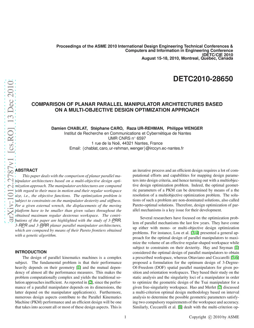 This paper deals with the comparison of planar parallel manipulator architectures based on a multi-objective design optimization approach. The manipulator architectures are compared with regard to their mass in motion and their regular workspace size, i.e., the objective functions. The optimization problem is subject to constraints on the manipulator dexterity and stiffness. For a given external wrench, the displacements of the moving platform have to be smaller than given values throughout the obtained maximum regular dexterous workspace. The contributions of the paper are highlighted with the study of 3-RPR, 3-RPR and 3-RPR planar parallel manipulator architectures, which are compared by means of their Pareto frontiers obtained with a genetic algorithm.