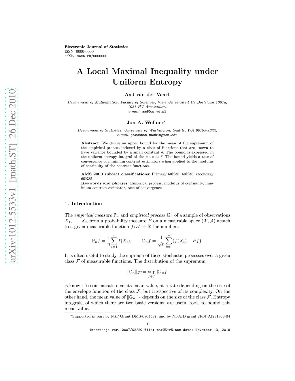 We derive an upper bound for the mean of the supremum of the empirical process indexed by a class of functions that are known to have variance bounded by a small constant . The bound is expressed in the uniform entropy integral of the class at . The bound yields a rate of convergence of minimum contrast estimators when applied to the modulus of continuity of the contrast functions.