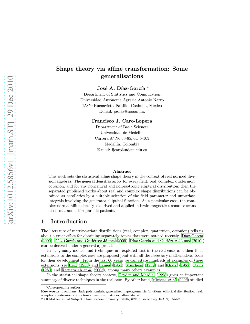This work sets the statistical affine shape theory in the context of real normed division algebras. The general densities apply for every field: real, complex, quaternion, octonion, and for any noncentral and non-isotropic elliptical distribution; then the separated published works about real and complex shape distributions can be obtained as corollaries by a suitable selection of the field parameter and univariate integrals involving the generator elliptical function. As a particular case, the complex normal affine density is derived and applied in brain magnetic resonance scans of normal and schizophrenic patients.