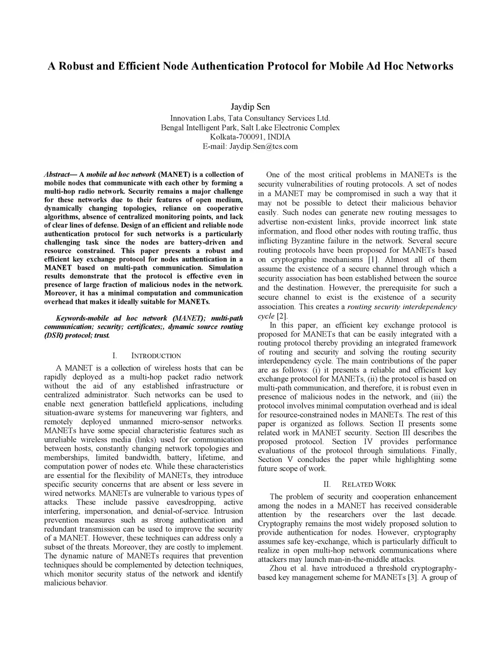 A mobile ad hoc network (MANET) is a collection of mobile nodes that communicate with each other by forming a multi-hop radio network. Security remains a major challenge for these networks due to their features of open medium, dynamically changing topologies, reliance on cooperative algorithms, absence of centralized monitoring points, and lack of clear lines of defense. Design of an efficient and reliable node authentication protocol for such networks is a particularly challenging task since the nodes are battery-driven and resource constrained. This paper presents a robust and efficient key exchange protocol for nodes authentication in a MANET based on multi-path communication. Simulation results demonstrate that the protocol is effective even in presence of large fraction of malicious nodes in the network. Moreover, it has a minimal computation and communication overhead that makes it ideally suitable for MANETs.
