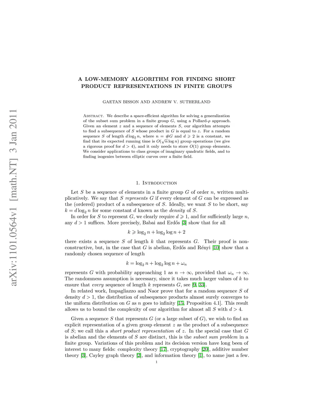 A low-memory algorithm for finding short product representations in