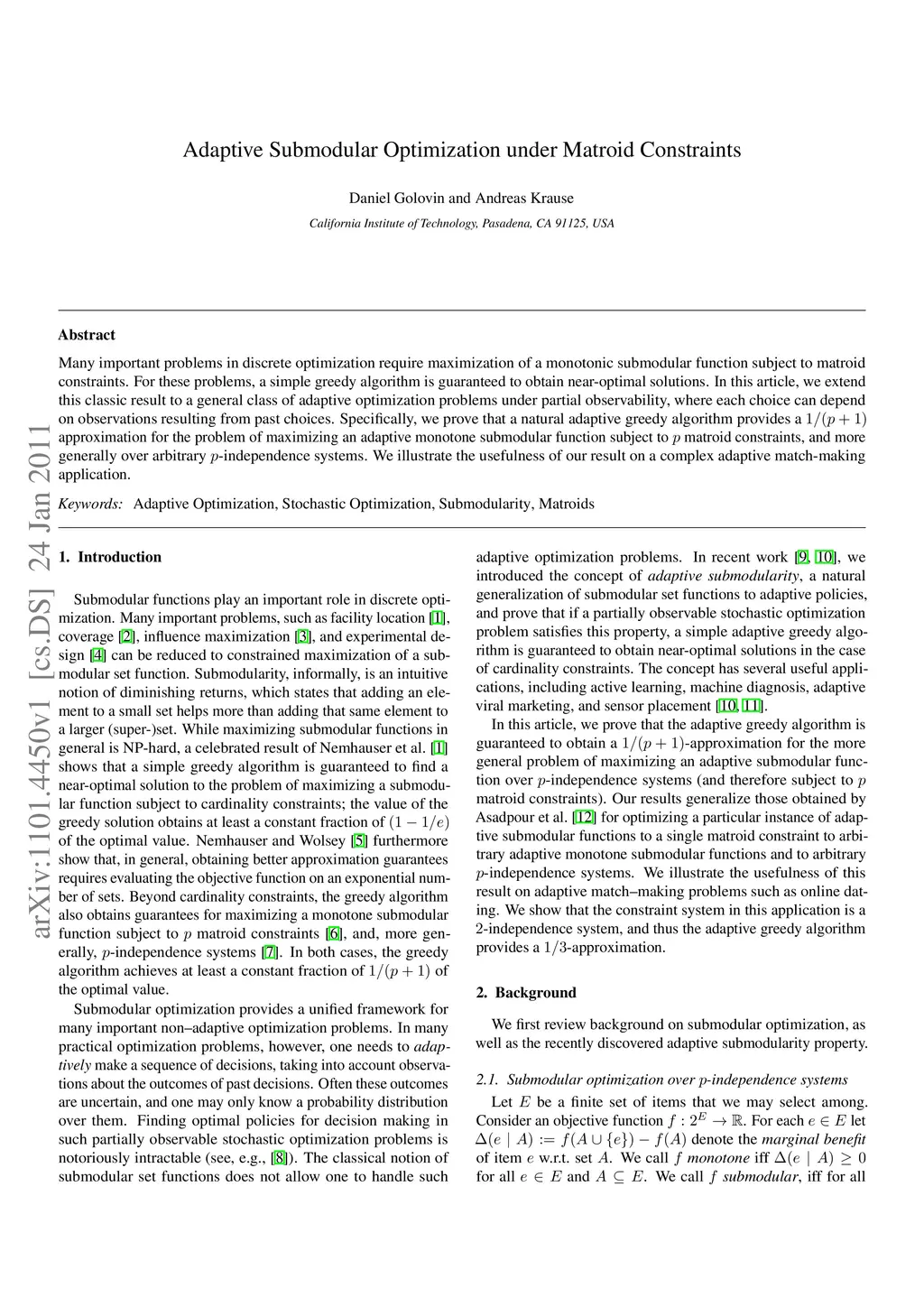 Many important problems in discrete optimization require maximization of a monotonic submodular function subject to matroid constraints. For these problems, a simple greedy algorithm is guaranteed to obtain near-optimal solutions. In this article, we extend this classic result to a general class of adaptive optimization problems under partial observability, where each choice can depend on observations resulting from past choices. Specifically, we prove that a natural adaptive greedy algorithm provides a approximation for the problem of maximizing an adaptive monotone submodular function subject to matroid constraints, and more generally over arbitrary -independence systems. We illustrate the usefulness of our result on a complex adaptive match-making application.