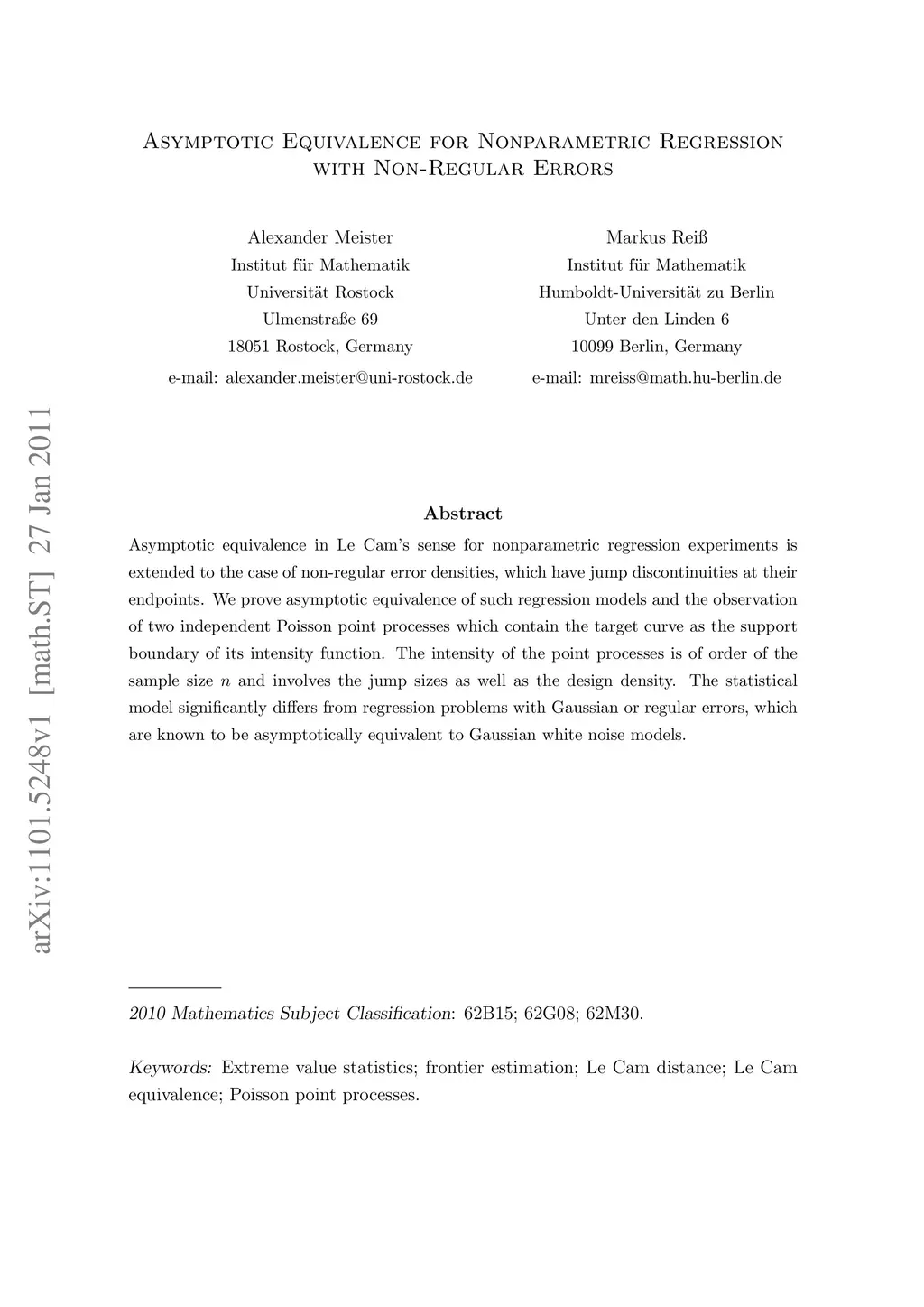 Asymptotic equivalence in Le Cam's sense for nonparametric regression experiments is extended to the case of non-regular error densities, which have jump discontinuities at their endpoints. We prove asymptotic equivalence of such regression models and the observation of two independent Poisson point processes which contain the target curve as the support boundary of its intensity function. The intensity of the point processes is of order of the sample size and involves the jump sizes as well as the design density. The statistical model significantly differs from regression problems with Gaussian or regular errors, which are known to be asymptotically equivalent to Gaussian white noise models.