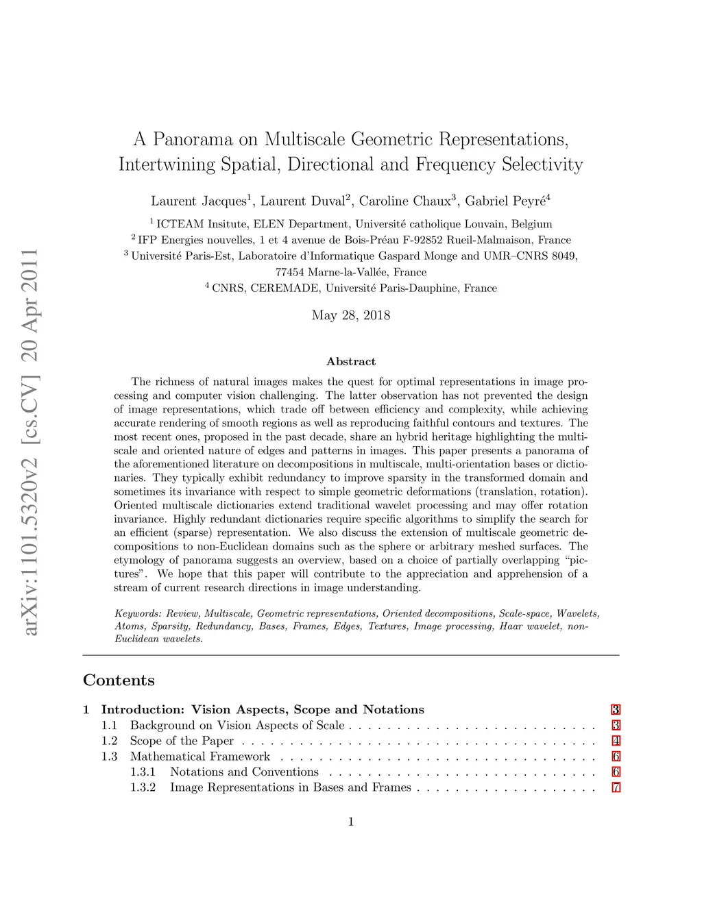 The richness of natural images makes the quest for optimal representations in image processing and computer vision challenging. This fact has not prevented the design of candidates, convenient for rendering smooth regions, contours and textures at the same time, with compromises between efficiency and complexity. The most recent ones, proposed in the past decade, share an hybrid heritage highlighting the multiscale and oriented nature of edges and patterns in images. This paper endeavors a panorama of the aforementioned literature on decompositions in multiscale, multi-orientation bases or dictionaries. They typically exhibit redundancy to improve both the sparsity of the representation, and sometimes its invariance to various geometric deformations. Oriented multiscale dictionaries extend traditional wavelet processing and may offer rotation invariance. Highly redundant dictionaries require specific algorithms to simplify the search for an efficient (sparse) representation. We also discuss the extension of multiscale geometric decompositions to non-Euclidean domains such as the sphere and arbitrary meshed surfaces in . The apt and patented etymology of panorama suggests an overview based on a choice of overlapping "pictures", i.e., selected from a broad set of computationally efficient mathematical tools. We hope this work help enlighten a substantial fraction of the present exciting research in image understanding, targeted to better capture data diversity.