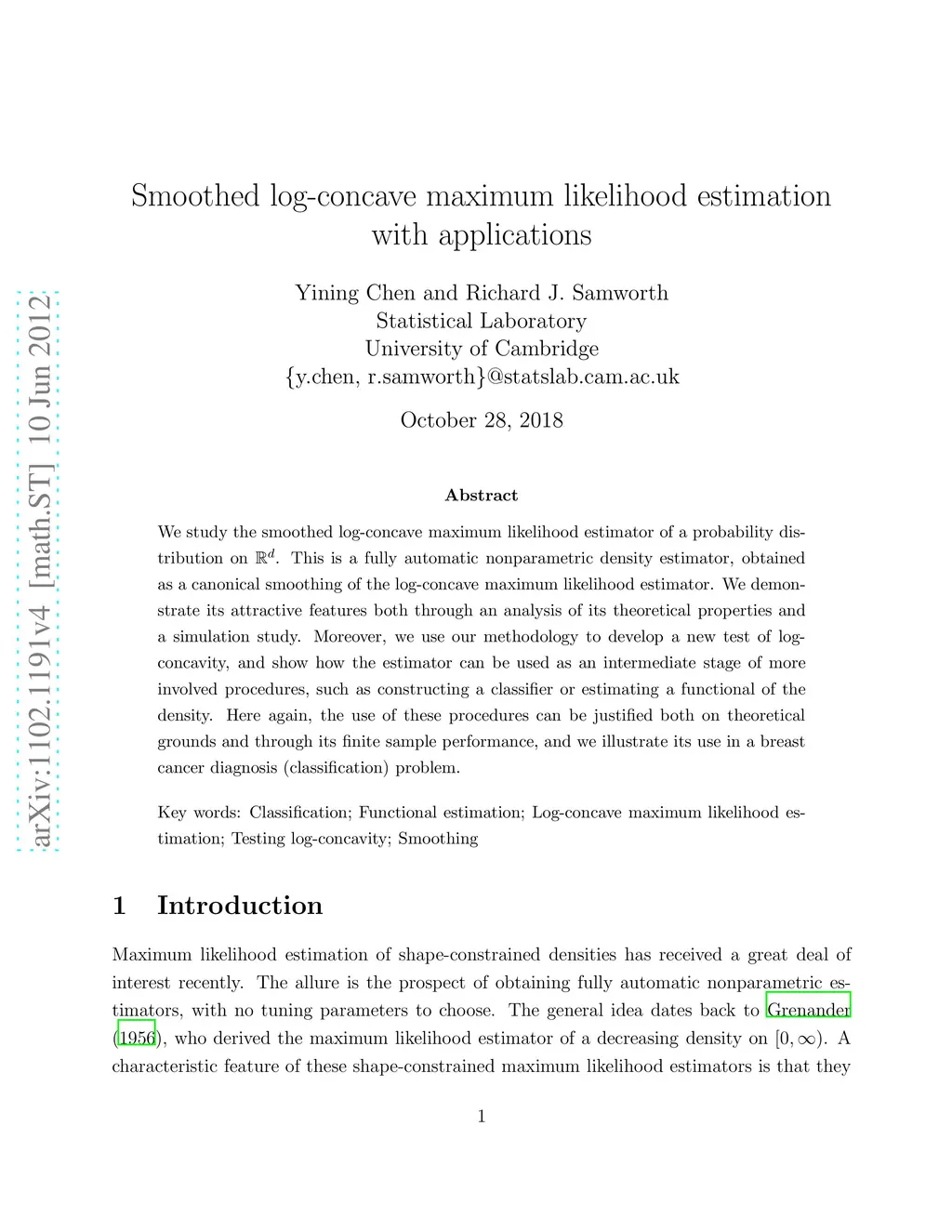 We study the smoothed log-concave maximum likelihood estimator of a probability distribution on . This is a fully automatic nonparametric density estimator, obtained as a canonical smoothing of the log-concave maximum likelihood estimator. We demonstrate its attractive features both through an analysis of its theoretical properties and a simulation study. Moreover, we use our methodology to develop a new test of log-concavity, and show how the estimator can be used as an intermediate stage of more involved procedures, such as constructing a classifier or estimating a functional of the density. Here again, the use of these procedures can be justified both on theoretical grounds and through its finite sample performance, and we illustrate its use in a breast cancer diagnosis (classification) problem.
