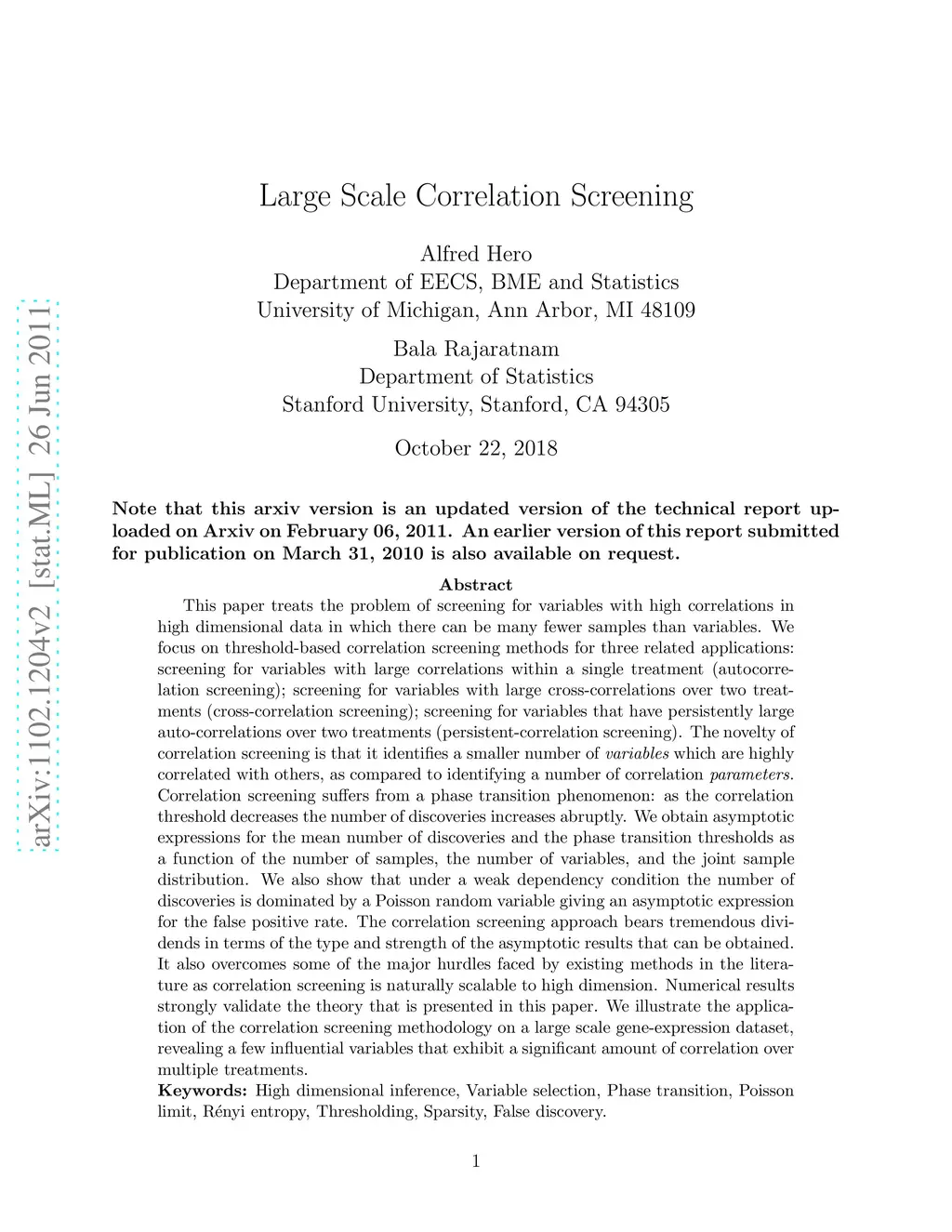 This paper treats the problem of screening for variables with high correlations in high dimensional data in which there can be many fewer samples than variables. We focus on threshold-based correlation screening methods for three related applications: screening for variables with large correlations within a single treatment (autocorrelation screening); screening for variables with large cross-correlations over two treatments (cross-correlation screening); screening for variables that have persistently large auto-correlations over two treatments (persistent-correlation screening). The novelty of correlation screening is that it identifies a smaller number of variables which are highly correlated with others, as compared to identifying a number of correlation parameters. Correlation screening suffers from a phase transition phenomenon: as the correlation threshold decreases the number of discoveries increases abruptly. We obtain asymptotic expressions for the mean number of discoveries and the phase transition thresholds as a function of the number of samples, the number of variables, and the joint sample distribution. We also show that under a weak dependency condition the number of discoveries is dominated by a Poisson random variable giving an asymptotic expression for the false positive rate. The correlation screening approach bears tremendous dividends in terms of the type and strength of the asymptotic results that can be obtained. It also overcomes some of the major hurdles faced by existing methods in the literature as correlation screening is naturally scalable to high dimension. Numerical results strongly validate the theory that is presented in this paper. We illustrate the application of the correlation screening methodology on a large scale gene-expression dataset, revealing a few influential variables that exhibit a significant amount of correlation over multiple treatments.