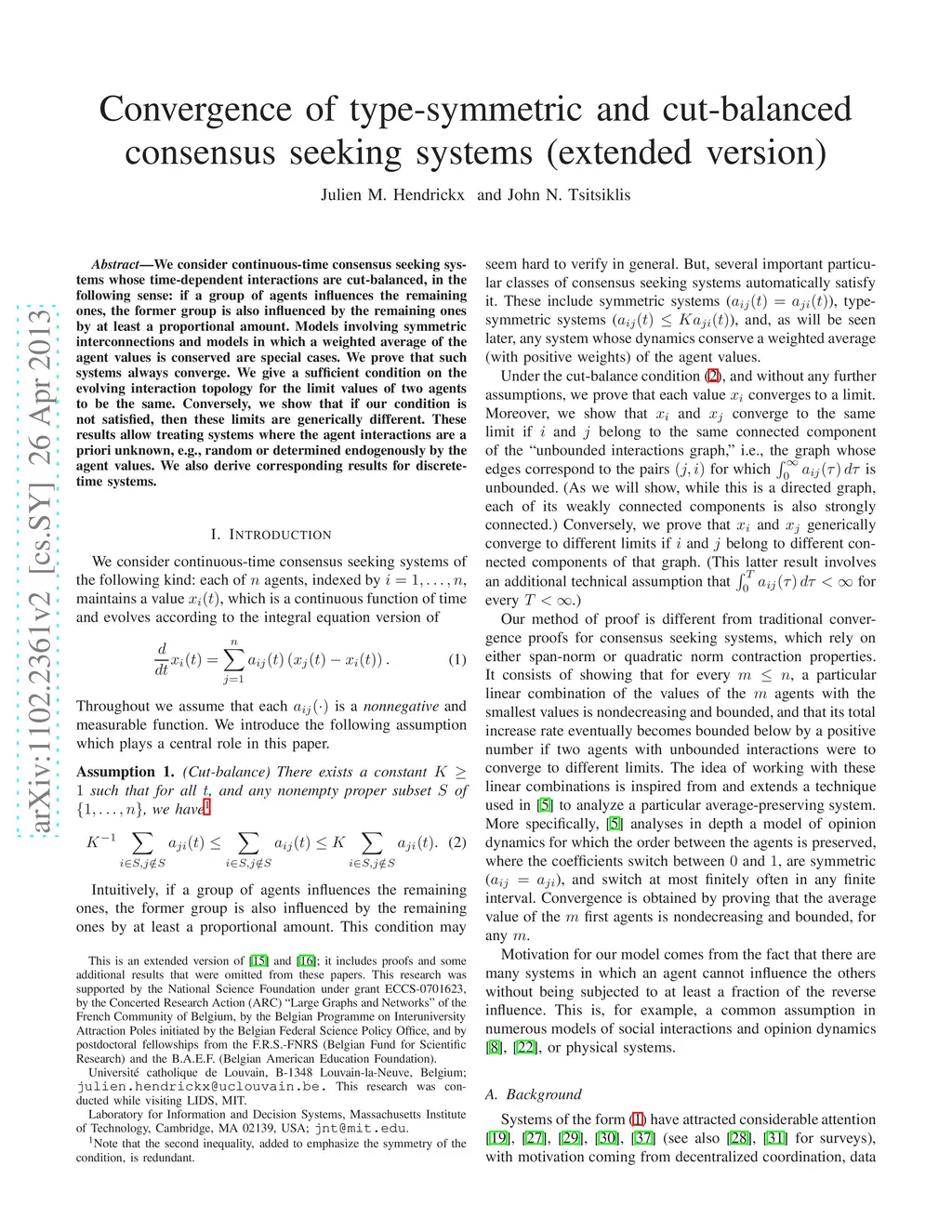 Convergence of type-symmetric and cut-balanced consensus seeking systems