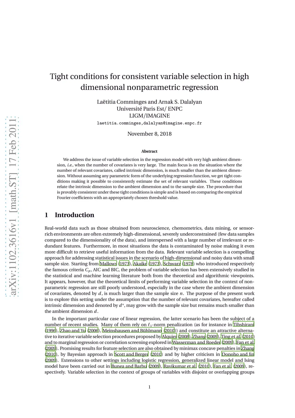 We address the issue of variable selection in the regression model with very high ambient dimension, i.e., when the number of covariates is very large. The main focus is on the situation where the number of relevant covariates, called intrinsic dimension, is much smaller than the ambient dimension. Without assuming any parametric form of the underlying regression function, we get tight conditions making it possible to consistently estimate the set of relevant variables. These conditions relate the intrinsic dimension to the ambient dimension and to the sample size. The procedure that is provably consistent under these tight conditions is simple and is based on comparing the empirical Fourier coefficients with an appropriately chosen threshold value.