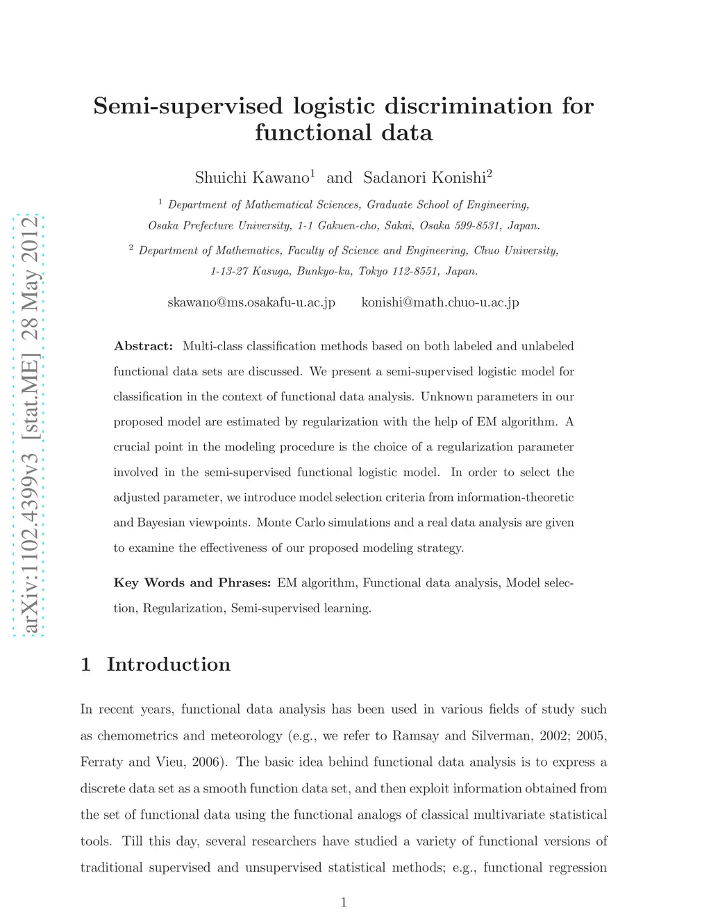 Multi-class classification methods based on both labeled and unlabeled functional data sets are discussed. We present semi-supervised logistic models for classification in the context of functional data analysis. Unknown parameters in our proposed models are estimated by regularization with the help of EM algorithm. Crucial points in modeling procedure are the choices of regularization parameter involved in the semi-supervised functional logistic models. In order to select the adjusted parameter, we introduce model selection criteria from information-theoretic and Bayesian viewpoints. Monte Carlo simulations and real data analysis are given to examine the effectiveness of proposed modeling strategies.