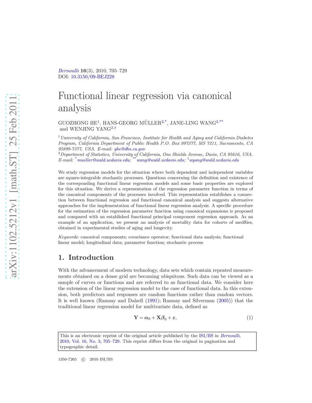 We study regression models for the situation where both dependent and independent variables are square-integrable stochastic processes. Questions concerning the definition and existence of the corresponding functional linear regression models and some basic properties are explored for this situation. We derive a representation of the regression parameter function in terms of the canonical components of the processes involved. This representation establishes a connection between functional regression and functional canonical analysis and suggests alternative approaches for the implementation of functional linear regression analysis. A specific procedure for the estimation of the regression parameter function using canonical expansions is proposed and compared with an established functional principal component regression approach. As an example of an application, we present an analysis of mortality data for cohorts of medflies, obtained in experimental studies of aging and longevity.
