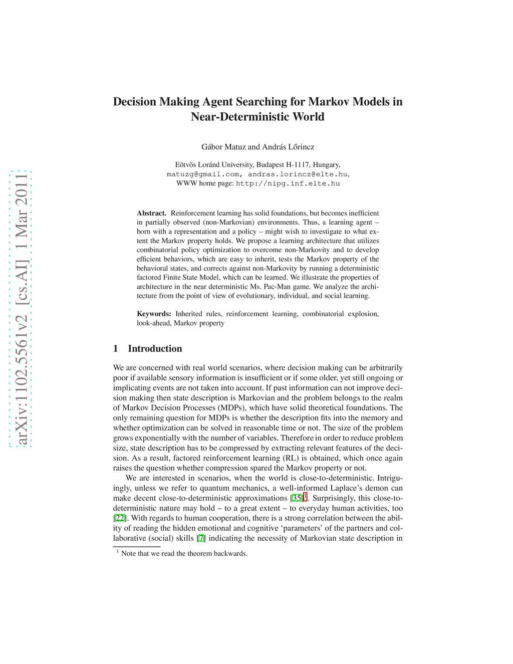 Reinforcement learning has solid foundations, but becomes inefficient in partially observed (non-Markovian) environments. Thus, a learning agent -born with a representation and a policy- might wish to investigate to what extent the Markov property holds. We propose a learning architecture that utilizes combinatorial policy optimization to overcome non-Markovity and to develop efficient behaviors, which are easy to inherit, tests the Markov property of the behavioral states, and corrects against non-Markovity by running a deterministic factored Finite State Model, which can be learned. We illustrate the properties of architecture in the near deterministic Ms. Pac-Man game. We analyze the architecture from the point of view of evolutionary, individual, and social learning.