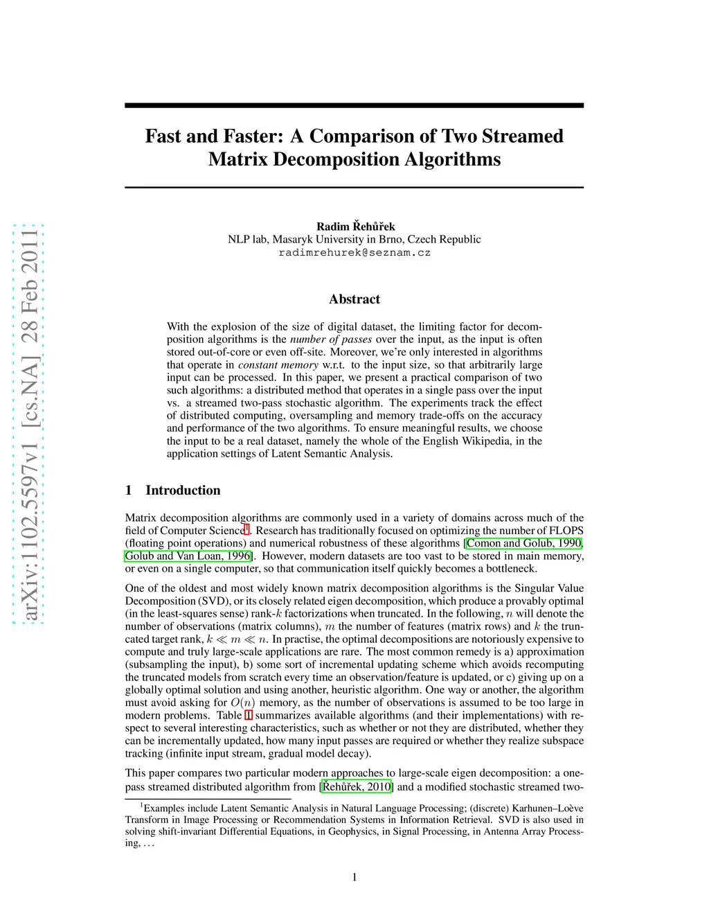 With the explosion of the size of digital dataset, the limiting factor for decomposition algorithms is the \emph{number of passes} over the input, as the input is often stored out-of-core or even off-site. Moreover, we're only interested in algorithms that operate in \emph{constant memory} w.r.t. to the input size, so that arbitrarily large input can be processed. In this paper, we present a practical comparison of two such algorithms: a distributed method that operates in a single pass over the input vs. a streamed two-pass stochastic algorithm. The experiments track the effect of distributed computing, oversampling and memory trade-offs on the accuracy and performance of the two algorithms. To ensure meaningful results, we choose the input to be a real dataset, namely the whole of the English Wikipedia, in the application settings of Latent Semantic Analysis.