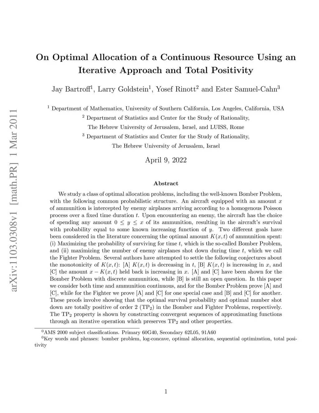 We study a class of optimal allocation problems, including the well-known Bomber Problem, with the following common probabilistic structure. An aircraft equipped with an amount~ of ammunition is intercepted by enemy airplanes arriving according to a homogenous Poisson process over a fixed time duration~. Upon encountering an enemy, the aircraft has the choice of spending any amount~ of its ammunition, resulting in the aircraft's survival with probability equal to some known increasing function of . Two different goals have been considered in the literature concerning the optimal amount~ of ammunition spent: (i)~Maximizing the probability of surviving for time~, which is the so-called Bomber Problem, and (ii) maximizing the number of enemy airplanes shot down during time~, which we call the Fighter Problem. Several authors have attempted to settle the following conjectures about the monotonicity of : [A] is decreasing in , [B] is increasing in , and [C] the amount~ held back is increasing in . [A] and [C] have been shown for the Bomber Problem with discrete ammunition, while [B] is still an open question. In this paper we consider both time and ammunition continuous, and for the Bomber Problem prove [A] and [C], while for the Fighter we prove [A] and [C] for one special case and [B] and [C] for another. These proofs involve showing that the optimal survival probability and optimal number shot down are totally positive of order 2 () in the Bomber and Fighter Problems, respectively. The property is shown by constructing convergent sequences of approximating functions through an iterative operation which preserves and other properties.