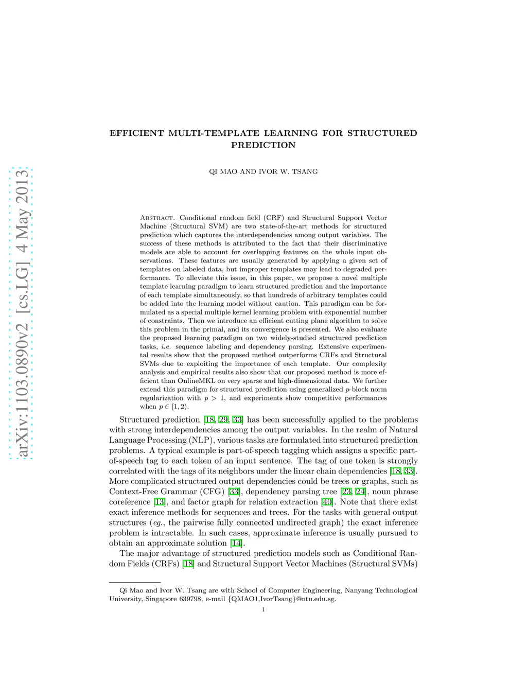 Conditional random field (CRF) and Structural Support Vector Machine (Structural SVM) are two state-of-the-art methods for structured prediction which captures the interdependencies among output variables. The success of these methods is attributed to the fact that their discriminative models are able to account for overlapping features on the whole input observations. These features are usually generated by applying a given set of templates on labeled data, but improper templates may lead to degraded performance. To alleviate this issue, in this paper, we propose a novel multiple template learning paradigm to learn structured prediction and the importance of each template simultaneously, so that hundreds of arbitrary templates could be added into the learning model without caution. This paradigm can be formulated as a special multiple kernel learning problem with exponential number of constraints. Then we introduce an efficient cutting plane algorithm to solve this problem in the primal, and its convergence is presented. We also evaluate the proposed learning paradigm on two widely-studied structured prediction tasks, \emph{i.e.} sequence labeling and dependency parsing. Extensive experimental results show that the proposed method outperforms CRFs and Structural SVMs due to exploiting the importance of each template. Our complexity analysis and empirical results also show that our proposed method is more efficient than OnlineMKL on very sparse and high-dimensional data. We further extend this paradigm for structured prediction using generalized -block norm regularization with , and experiments show competitive performances when .