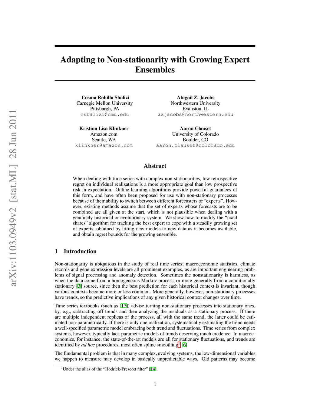 When dealing with time series with complex non-stationarities, low retrospective regret on individual realizations is a more appropriate goal than low prospective risk in expectation. Online learning algorithms provide powerful guarantees of this form, and have often been proposed for use with non-stationary processes because of their ability to switch between different forecasters or ``experts''. However, existing methods assume that the set of experts whose forecasts are to be combined are all given at the start, which is not plausible when dealing with a genuinely historical or evolutionary system. We show how to modify the ``fixed shares'' algorithm for tracking the best expert to cope with a steadily growing set of experts, obtained by fitting new models to new data as it becomes available, and obtain regret bounds for the growing ensemble.