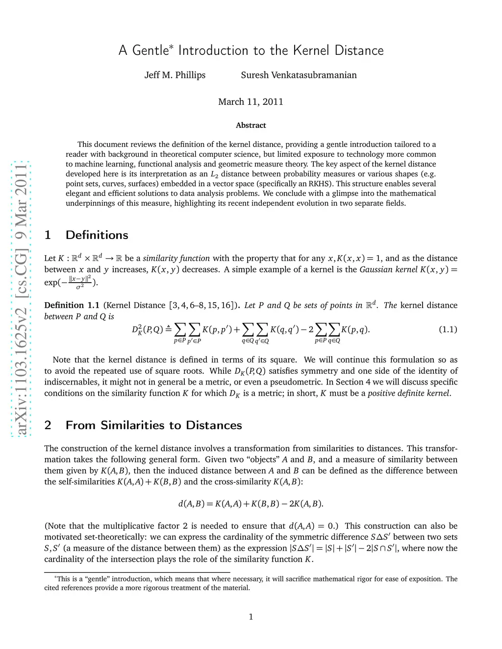 This document reviews the definition of the kernel distance, providing a gentle introduction tailored to a reader with background in theoretical computer science, but limited exposure to technology more common to machine learning, functional analysis and geometric measure theory. The key aspect of the kernel distance developed here is its interpretation as an L_2 distance between probability measures or various shapes (e.g. point sets, curves, surfaces) embedded in a vector space (specifically an RKHS). This structure enables several elegant and efficient solutions to data analysis problems. We conclude with a glimpse into the mathematical underpinnings of this measure, highlighting its recent independent evolution in two separate fields.