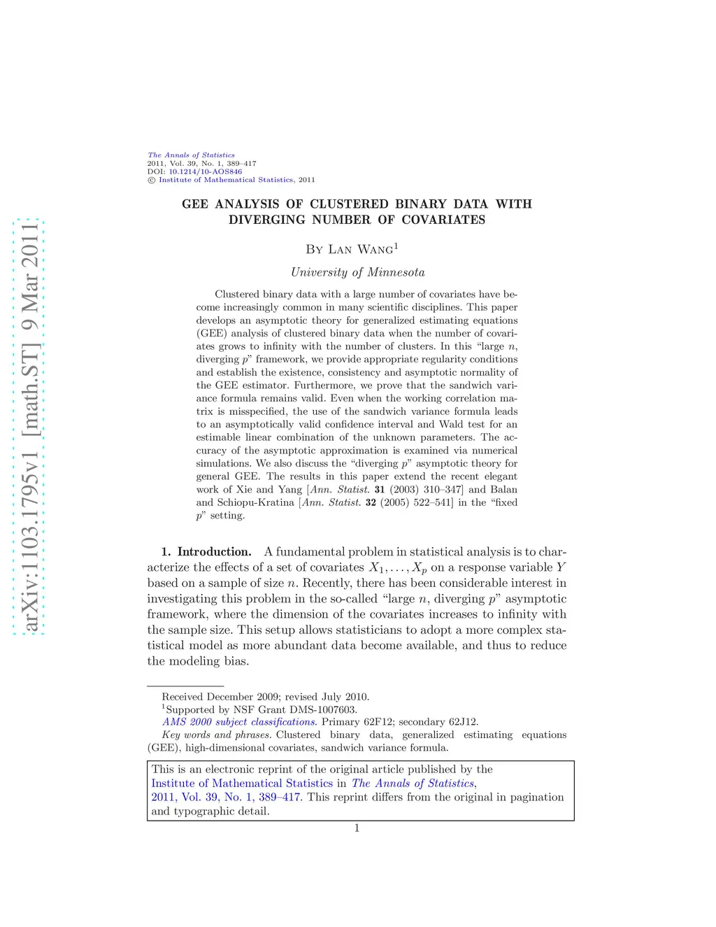 Clustered binary data with a large number of covariates have become increasingly common in many scientific disciplines. This paper develops an asymptotic theory for generalized estimating equations (GEE) analysis of clustered binary data when the number of covariates grows to infinity with the number of clusters. In this "large , diverging " framework, we provide appropriate regularity conditions and establish the existence, consistency and asymptotic normality of the GEE estimator. Furthermore, we prove that the sandwich variance formula remains valid. Even when the working correlation matrix is misspecified, the use of the sandwich variance formula leads to an asymptotically valid confidence interval and Wald test for an estimable linear combination of the unknown parameters. The accuracy of the asymptotic approximation is examined via numerical simulations. We also discuss the "diverging " asymptotic theory for general GEE. The results in this paper extend the recent elegant work of Xie and Yang [Ann. Statist. 31 (2003) 310--347] and Balan and Schiopu-Kratina [Ann. Statist. 32 (2005) 522--541] in the "fixed " setting.