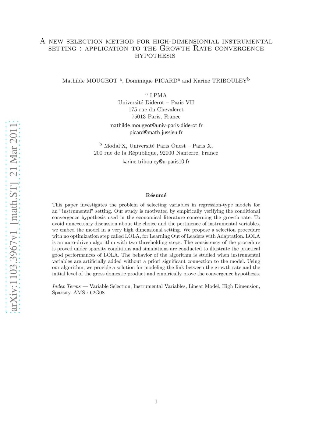 This paper investigates the problem of selecting variables in regression-type models for an "instrumental" setting. Our study is motivated by empirically verifying the conditional convergence hypothesis used in the economical literature concerning the growth rate. To avoid unnecessary discussion about the choice and the pertinence of instrumental variables, we embed the model in a very high dimensional setting. We propose a selection procedure with no optimization step called LOLA, for Learning Out of Leaders with Adaptation. LOLA is an auto-driven algorithm with two thresholding steps. The consistency of the procedure is proved under sparsity conditions and simulations are conducted to illustrate the practical good performances of LOLA. The behavior of the algorithm is studied when instrumental variables are artificially added without a priori significant connection to the model. Using our algorithm, we provide a solution for modeling the link between the growth rate and the initial level of the gross domestic product and empirically prove the convergence hypothesis.