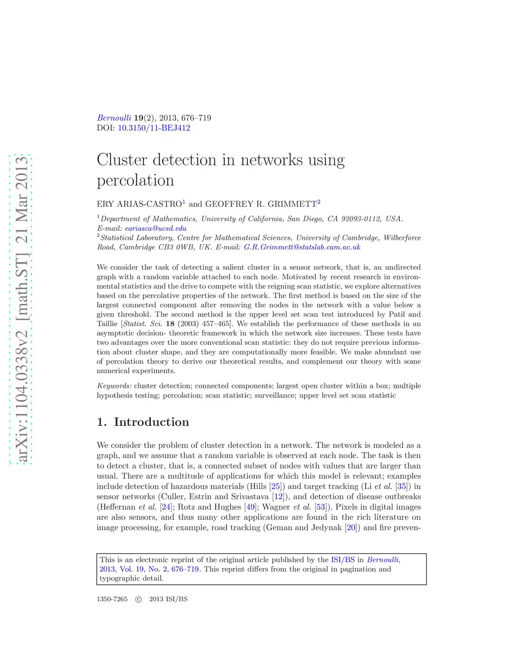 We consider the task of detecting a salient cluster in a sensor network, that is, an undirected graph with a random variable attached to each node. Motivated by recent research in environmental statistics and the drive to compete with the reigning scan statistic, we explore alternatives based on the percolative properties of the network. The first method is based on the size of the largest connected component after removing the nodes in the network with a value below a given threshold. The second method is the upper level set scan test introduced by Patil and Taillie [Statist. Sci. 18 (2003) 457-465]. We establish the performance of these methods in an asymptotic decision- theoretic framework in which the network size increases. These tests have two advantages over the more conventional scan statistic: they do not require previous information about cluster shape, and they are computationally more feasible. We make abundant use of percolation theory to derive our theoretical results, and complement our theory with some numerical experiments.