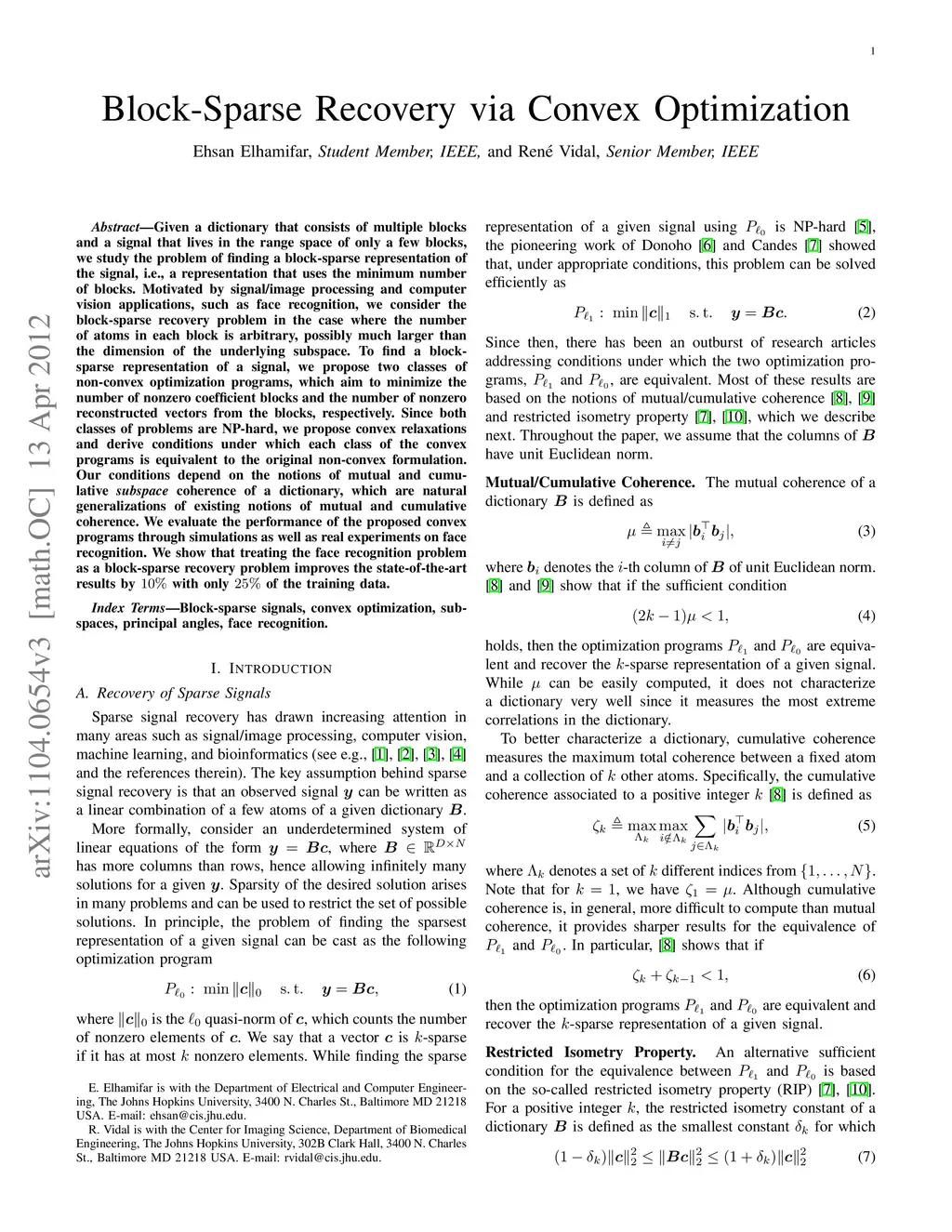Given a dictionary that consists of multiple blocks and a signal that lives in the range space of only a few blocks, we study the problem of finding a block-sparse representation of the signal, i.e., a representation that uses the minimum number of blocks. Motivated by signal/image processing and computer vision applications, such as face recognition, we consider the block-sparse recovery problem in the case where the number of atoms in each block is arbitrary, possibly much larger than the dimension of the underlying subspace. To find a block-sparse representation of a signal, we propose two classes of non-convex optimization programs, which aim to minimize the number of nonzero coefficient blocks and the number of nonzero reconstructed vectors from the blocks, respectively. Since both classes of problems are NP-hard, we propose convex relaxations and derive conditions under which each class of the convex programs is equivalent to the original non-convex formulation. Our conditions depend on the notions of mutual and cumulative subspace coherence of a dictionary, which are natural generalizations of existing notions of mutual and cumulative coherence. We evaluate the performance of the proposed convex programs through simulations as well as real experiments on face recognition. We show that treating the face recognition problem as a block-sparse recovery problem improves the state-of-the-art results by 10% with only 25% of the training data.