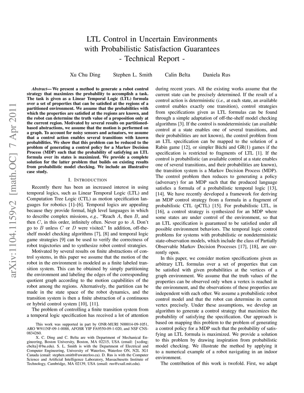 We present a method to generate a robot control strategy that maximizes the probability to accomplish a task. The task is given as a Linear Temporal Logic (LTL) formula over a set of properties that can be satisfied at the regions of a partitioned environment. We assume that the probabilities with which the properties are satisfied at the regions are known, and the robot can determine the truth value of a proposition only at the current region. Motivated by several results on partitioned-based abstractions, we assume that the motion is performed on a graph. To account for noisy sensors and actuators, we assume that a control action enables several transitions with known probabilities. We show that this problem can be reduced to the problem of generating a control policy for a Markov Decision Process (MDP) such that the probability of satisfying an LTL formula over its states is maximized. We provide a complete solution for the latter problem that builds on existing results from probabilistic model checking. We include an illustrative case study.