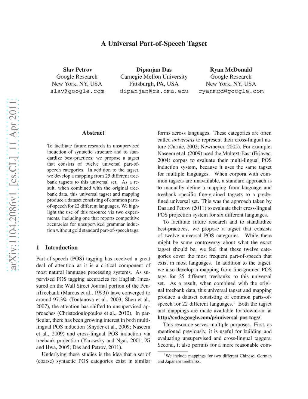 To facilitate future research in unsupervised induction of syntactic structure and to standardize best-practices, we propose a tagset that consists of twelve universal part-of-speech categories. In addition to the tagset, we develop a mapping from 25 different treebank tagsets to this universal set. As a result, when combined with the original treebank data, this universal tagset and mapping produce a dataset consisting of common parts-of-speech for 22 different languages. We highlight the use of this resource via two experiments, including one that reports competitive accuracies for unsupervised grammar induction without gold standard part-of-speech tags.