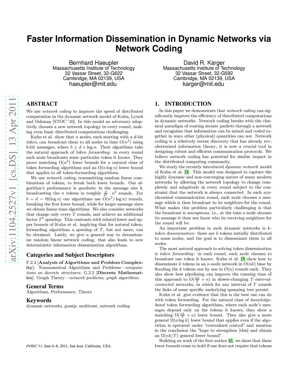 We use network coding to improve the speed of distributed computation in the dynamic network model of Kuhn, Lynch and Oshman [STOC '10]. In this model an adversary adaptively chooses a new network topology in every round, making even basic distributed computations challenging. Kuhn et al. show that n nodes, each starting with a d-bit token, can broadcast them to all nodes in time O(n^2) using b-bit messages, where b > d + log n. Their algorithms take the natural approach of {token forwarding}: in every round each node broadcasts some particular token it knows. They prove matching Omega(n^2) lower bounds for a natural class of token forwarding algorithms and an Omega(n log n) lower bound that applies to all token-forwarding algorithms. We use network coding, transmitting random linear combinations of tokens, to break both lower bounds. Our algorithm's performance is quadratic in the message size b, broadcasting the n tokens in roughly d/b^2 * n^2 rounds. For b = d = O(log n) our algorithms use O(n^2/log n) rounds, breaking the first lower bound, while for larger message sizes we obtain linear-time algorithms. We also consider networks that change only every T rounds, and achieve an additional factor T^2 speedup. This contrasts with related lower and upper bounds of Kuhn et al. implying that for natural token-forwarding algorithms a speedup of T, but not more, can be obtained. Lastly, we give a general way to derandomize random linear network coding, that also leads to new deterministic information dissemination algorithms.