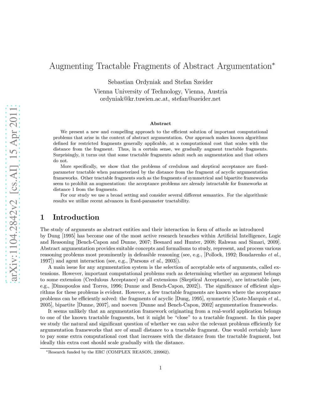 We present a new and compelling approach to the efficient solution of important computational problems that arise in the context of abstract argumentation. Our approach makes known algorithms defined for restricted fragments generally applicable, at a computational cost that scales with the distance from the fragment. Thus, in a certain sense, we gradually augment tractable fragments. Surprisingly, it turns out that some tractable fragments admit such an augmentation and that others do not. More specifically, we show that the problems of credulous and skeptical acceptance are fixed-parameter tractable when parameterized by the distance from the fragment of acyclic argumentation frameworks. Other tractable fragments such as the fragments of symmetrical and bipartite frameworks seem to prohibit an augmentation: the acceptance problems are already intractable for frameworks at distance 1 from the fragments. For our study we use a broad setting and consider several different semantics. For the algorithmic results we utilize recent advances in fixed-parameter tractability.