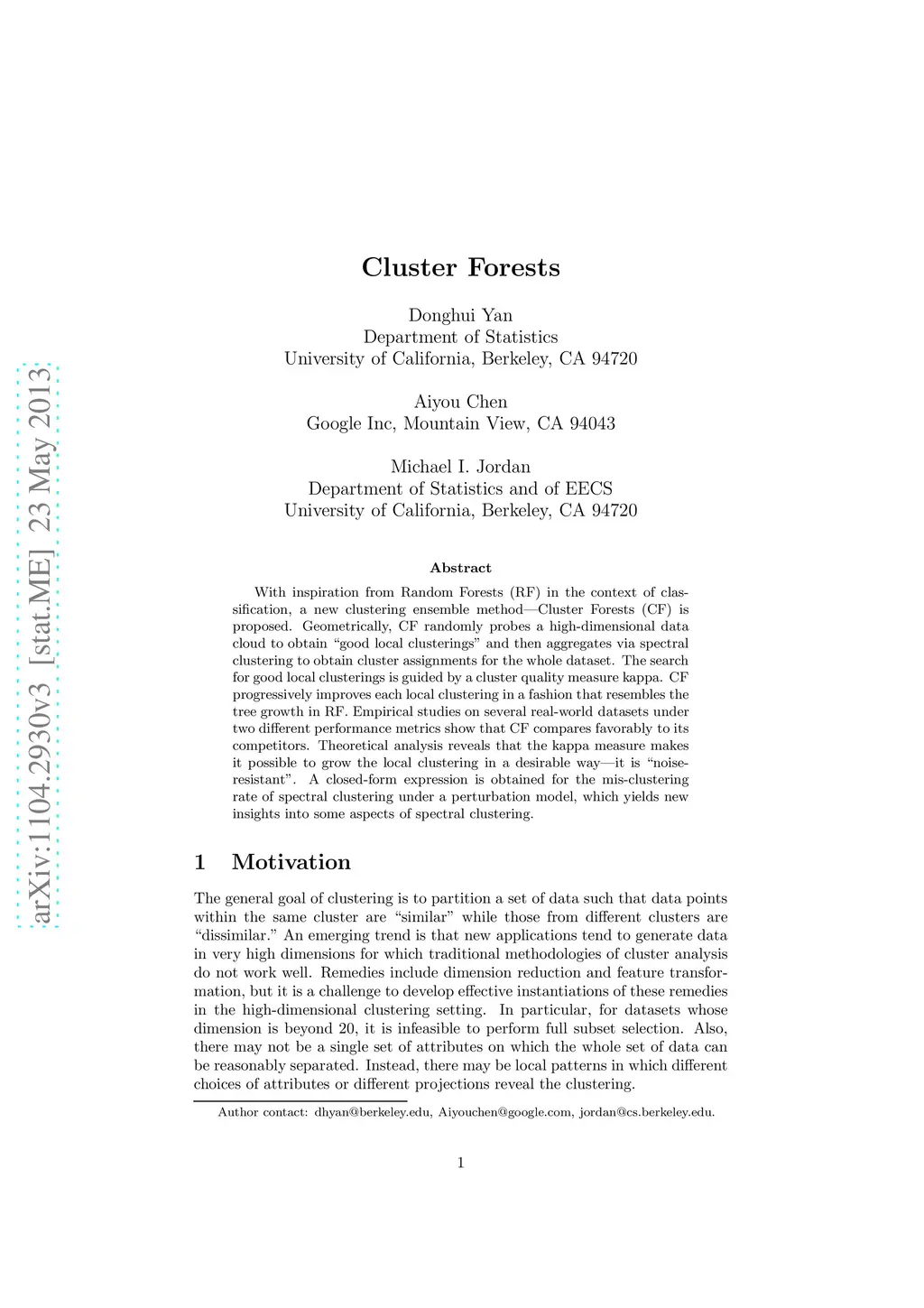 Inspired by Random Forests (RF) in the context of classification, we propose a new clustering ensemble method---Cluster Forests (CF). Geometrically, CF randomly probes a high-dimensional data cloud to obtain "good local clusterings" and then aggregates via spectral clustering to obtain cluster assignments for the whole dataset. The search for good local clusterings is guided by a cluster quality measure . CF progressively improves each local clustering in a fashion that resembles the tree growth in RF. Empirical studies on several real-world datasets under two different performance metrics show that CF compares favorably to its competitors. Theoretical analysis shows that the criterion is shown to grow each local clustering in a desirable way---it is "noise-resistant." A closed-form expression is obtained for the mis-clustering rate of spectral clustering under a perturbation model, which yields new insights into some aspects of spectral clustering.