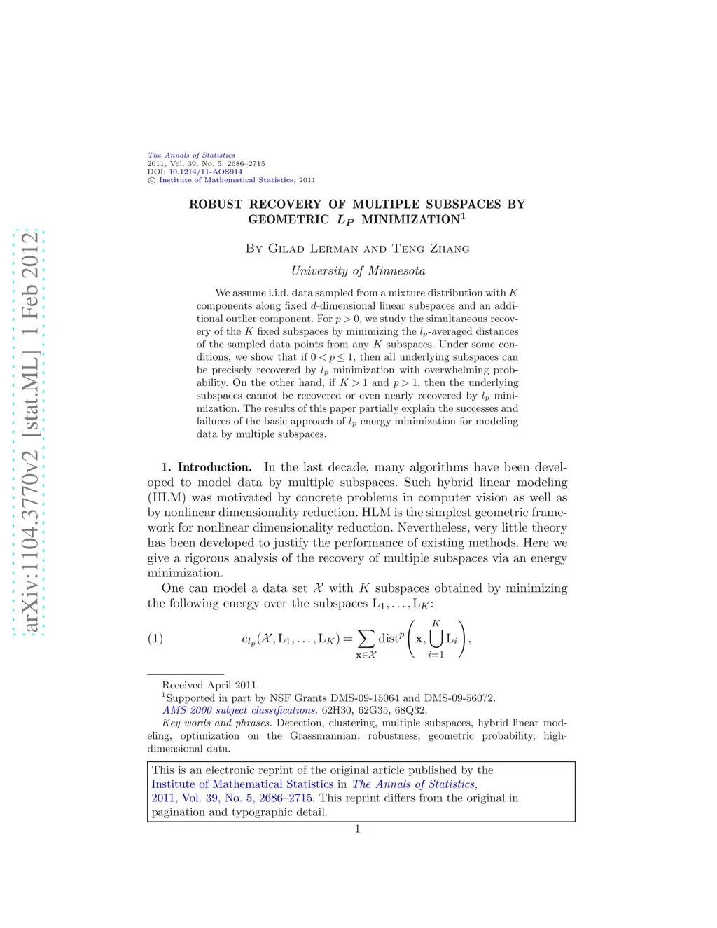Robust recovery of multiple subspaces by geometric l_p minimization