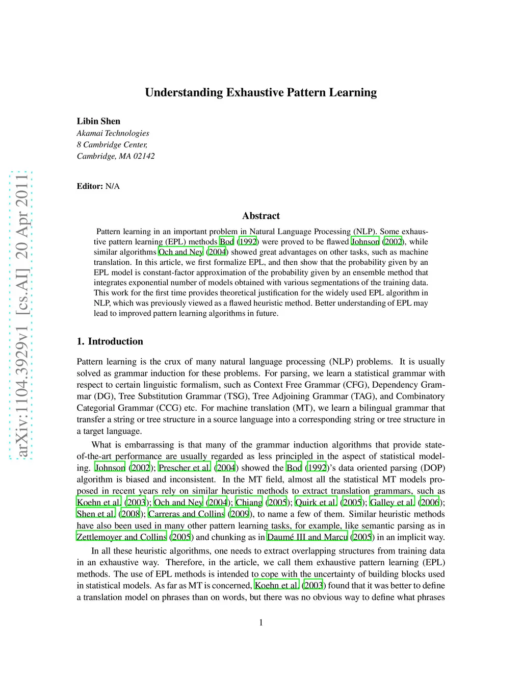 Pattern learning in an important problem in Natural Language Processing (NLP). Some exhaustive pattern learning (EPL) methods (Bod, 1992) were proved to be flawed (Johnson, 2002), while similar algorithms (Och and Ney, 2004) showed great advantages on other tasks, such as machine translation. In this article, we first formalize EPL, and then show that the probability given by an EPL model is constant-factor approximation of the probability given by an ensemble method that integrates exponential number of models obtained with various segmentations of the training data. This work for the first time provides theoretical justification for the widely used EPL algorithm in NLP, which was previously viewed as a flawed heuristic method. Better understanding of EPL may lead to improved pattern learning algorithms in future.