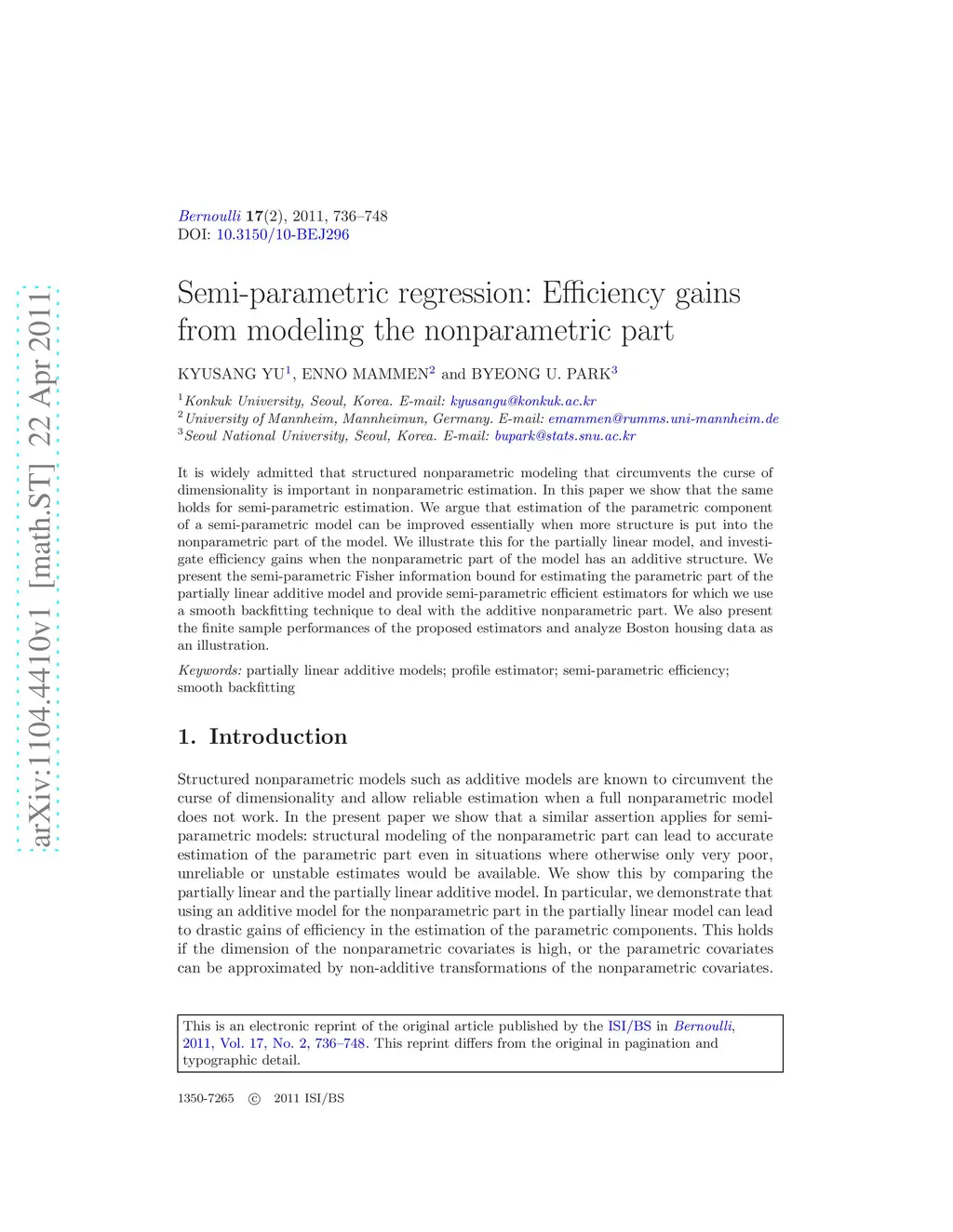 It is widely admitted that structured nonparametric modeling that circumvents the curse of dimensionality is important in nonparametric estimation. In this paper we show that the same holds for semi-parametric estimation. We argue that estimation of the parametric component of a semi-parametric model can be improved essentially when more structure is put into the nonparametric part of the model. We illustrate this for the partially linear model, and investigate efficiency gains when the nonparametric part of the model has an additive structure. We present the semi-parametric Fisher information bound for estimating the parametric part of the partially linear additive model and provide semi-parametric efficient estimators for which we use a smooth backfitting technique to deal with the additive nonparametric part. We also present the finite sample performances of the proposed estimators and analyze Boston housing data as an illustration.