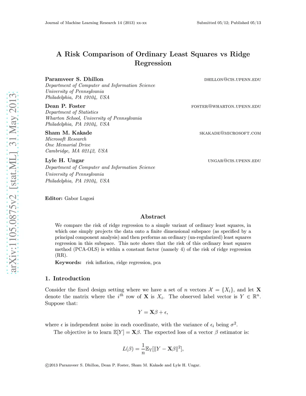 A Risk Comparison of Ordinary Least Squares vs Ridge Regression