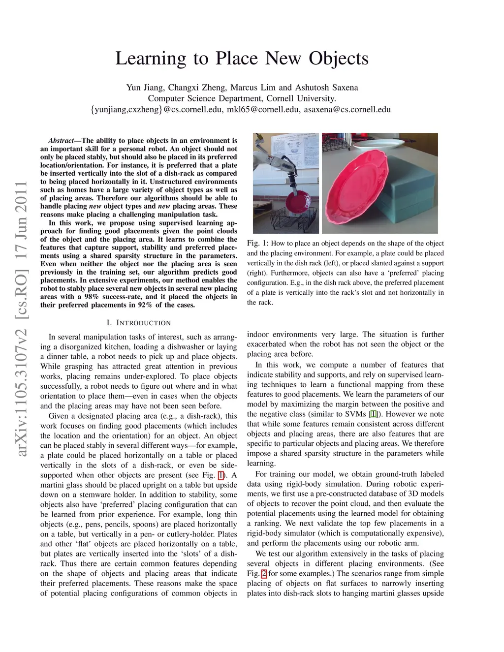 The ability to place objects in the environment is an important skill for a personal robot. An object should not only be placed stably, but should also be placed in its preferred location/orientation. For instance, a plate is preferred to be inserted vertically into the slot of a dish-rack as compared to be placed horizontally in it. Unstructured environments such as homes have a large variety of object types as well as of placing areas. Therefore our algorithms should be able to handle placing new object types and new placing areas. These reasons make placing a challenging manipulation task. In this work, we propose a supervised learning algorithm for finding good placements given the point-clouds of the object and the placing area. It learns to combine the features that capture support, stability and preferred placements using a shared sparsity structure in the parameters. Even when neither the object nor the placing area is seen previously in the training set, our algorithm predicts good placements. In extensive experiments, our method enables the robot to stably place several new objects in several new placing areas with 98% success-rate; and it placed the objects in their preferred placements in 92% of the cases.