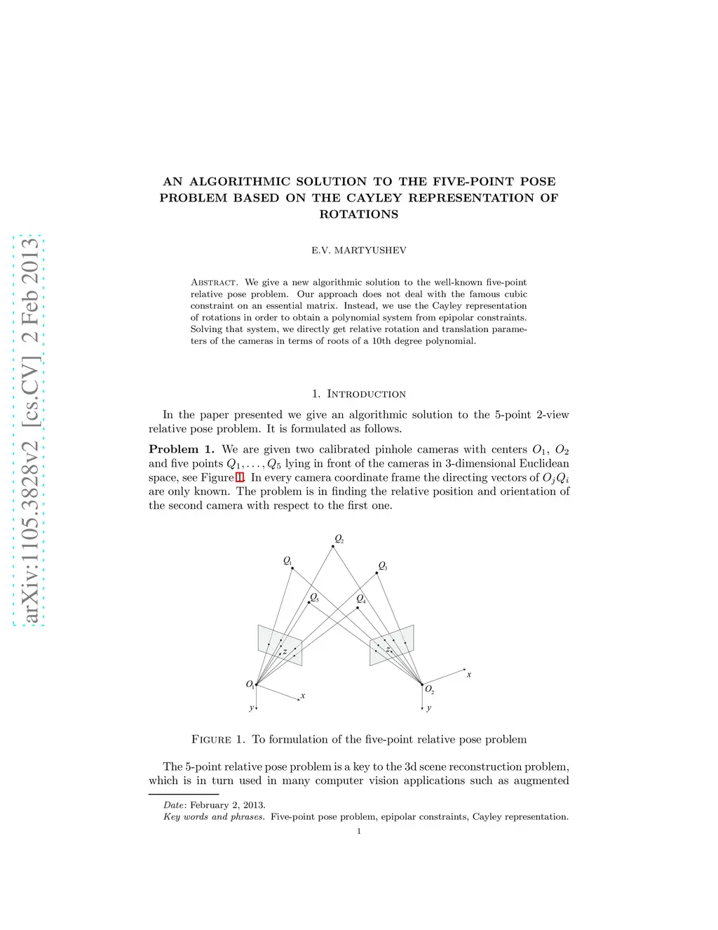 We give a new algorithmic solution to the well-known five-point relative pose problem. Our approach does not deal with the famous cubic constraint on an essential matrix. Instead, we use the Cayley representation of rotations in order to obtain a polynomial system from epipolar constraints. Solving that system, we directly get relative rotation and translation parameters of the cameras in terms of roots of a 10th degree polynomial.