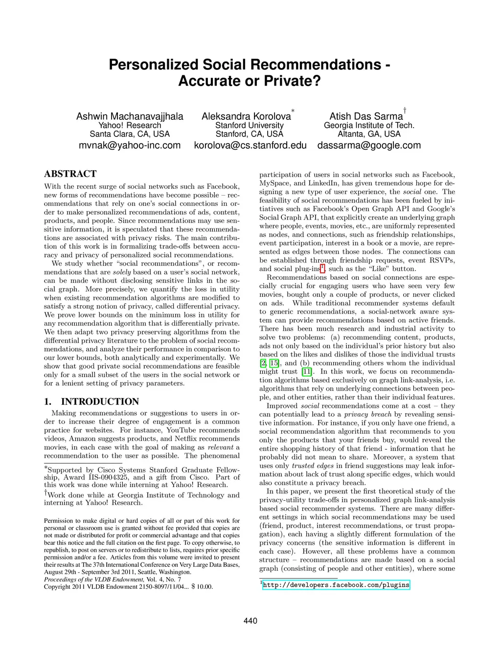 With the recent surge of social networks like Facebook, new forms of recommendations have become possible - personalized recommendations of ads, content, and even new friend and product connections based on one's social interactions. Since recommendations may use sensitive social information, it is speculated that these recommendations are associated with privacy risks. The main contribution of this work is in formalizing these expected trade-offs between the accuracy and privacy of personalized social recommendations. In this paper, we study whether "social recommendations", or recommendations that are solely based on a user's social network, can be made without disclosing sensitive links in the social graph. More precisely, we quantify the loss in utility when existing recommendation algorithms are modified to satisfy a strong notion of privacy, called differential privacy. We prove lower bounds on the minimum loss in utility for any recommendation algorithm that is differentially private. We adapt two privacy preserving algorithms from the differential privacy literature to the problem of social recommendations, and analyze their performance in comparison to the lower bounds, both analytically and experimentally. We show that good private social recommendations are feasible only for a small subset of the users in the social network or for a lenient setting of privacy parameters.