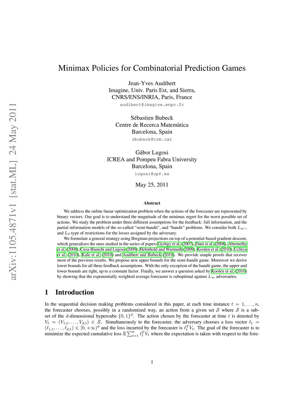 We address the online linear optimization problem when the actions of the forecaster are represented by binary vectors. Our goal is to understand the magnitude of the minimax regret for the worst possible set of actions. We study the problem under three different assumptions for the feedback: full information, and the partial information models of the so-called "semi-bandit", and "bandit" problems. We consider both -, and -type of restrictions for the losses assigned by the adversary. We formulate a general strategy using Bregman projections on top of a potential-based gradient descent, which generalizes the ones studied in the series of papers Gyorgy et al. (2007), Dani et al. (2008), Abernethy et al. (2008), Cesa-Bianchi and Lugosi (2009), Helmbold and Warmuth (2009), Koolen et al. (2010), Uchiya et al. (2010), Kale et al. (2010) and Audibert and Bubeck (2010). We provide simple proofs that recover most of the previous results. We propose new upper bounds for the semi-bandit game. Moreover we derive lower bounds for all three feedback assumptions. With the only exception of the bandit game, the upper and lower bounds are tight, up to a constant factor. Finally, we answer a question asked by Koolen et al. (2010) by showing that the exponentially weighted average forecaster is suboptimal against adversaries.