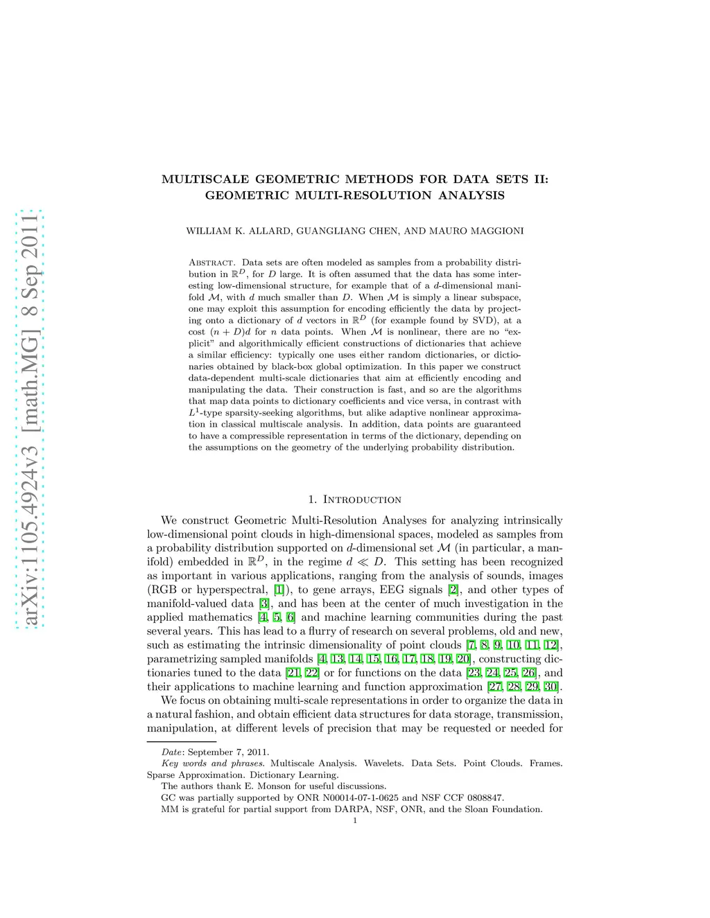 Data sets are often modeled as point clouds in , for large. It is often assumed that the data has some interesting low-dimensional structure, for example that of a -dimensional manifold , with much smaller than . When is simply a linear subspace, one may exploit this assumption for encoding efficiently the data by projecting onto a dictionary of vectors in (for example found by SVD), at a cost for data points. When is nonlinear, there are no "explicit" constructions of dictionaries that achieve a similar efficiency: typically one uses either random dictionaries, or dictionaries obtained by black-box optimization. In this paper we construct data-dependent multi-scale dictionaries that aim at efficient encoding and manipulating of the data. Their construction is fast, and so are the algorithms that map data points to dictionary coefficients and vice versa. In addition, data points are guaranteed to have a sparse representation in terms of the dictionary. We think of dictionaries as the analogue of wavelets, but for approximating point clouds rather than functions.