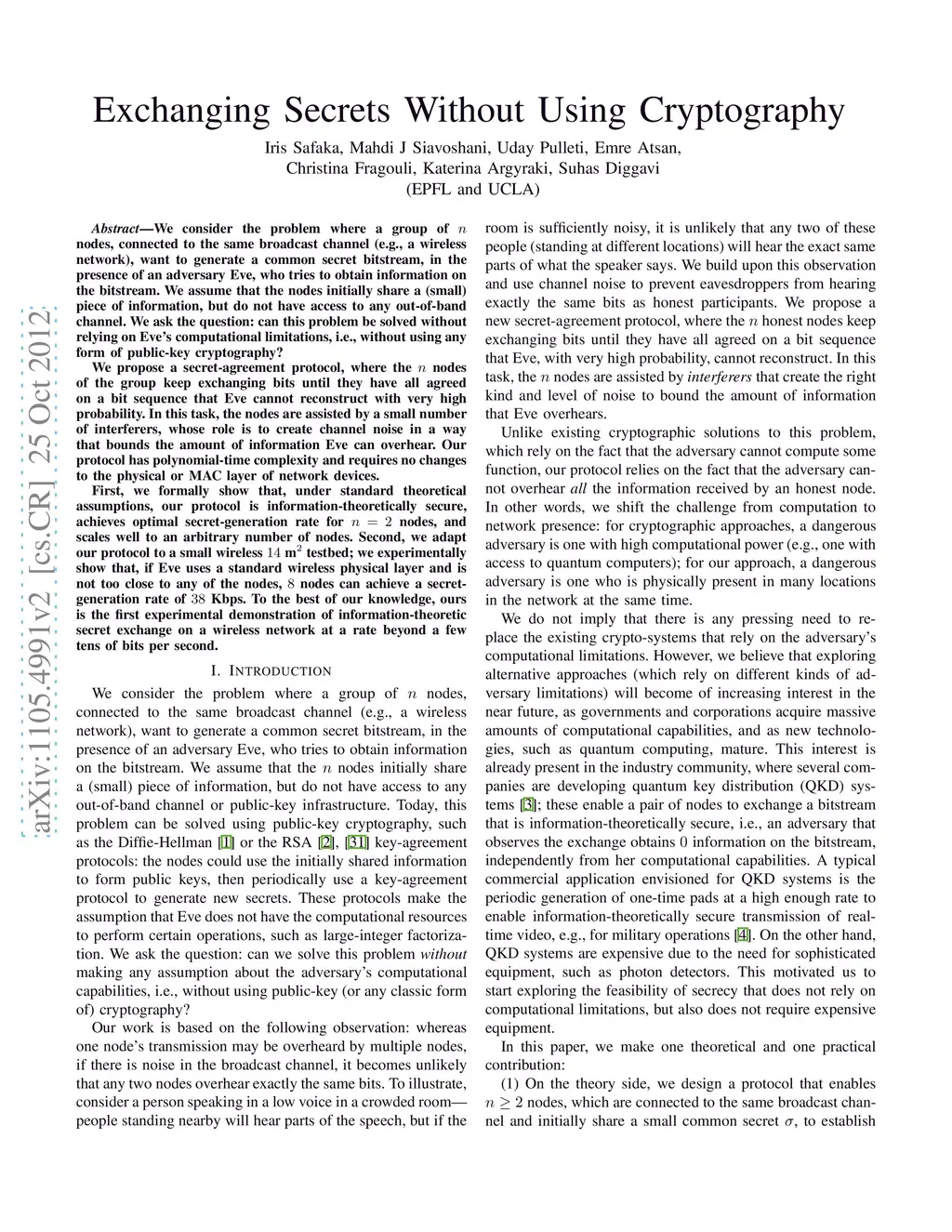 We address the problem of a group of n nodes, connected to the same broadcast channel (e.g., a wireless network), wanting to establish a common secret in the presence of a passive eavesdropper. If these nodes have no access to an out-of-band channel, the only practical solution today is to use public-key cryptography,which relies on the assumption that an adversary has limited computational capabilities. In this paper we ask the question: can this problem be solved without using any formof cryptography, and thus not relying on the adversary's computational limitation? We propose a secret-agreement protocol,where the n nodes of the group keep exchanging bits until they have all agreed on a bit sequence that the eavesdropper cannot reconstruct. In this task, the n nodes are assisted by a small number of interferers, whose role is to create channel noise in a way that bounds the amount of information the eavesdropper can overhear. Our protocol has polynomial-time complexity and requires no changes to the physical or MAC layer of network devices. We formally prove its optimality properties, show that it scales well to an arbitrary number of nodes, and experimentally demonstrate that it can generate 150 secret kilobits per second in a small testbed of 8 wireless nodes.