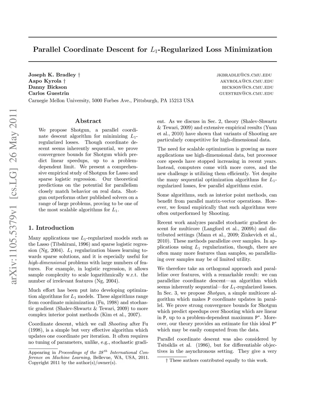 Parallel Coordinate Descent for L1-Regularized Loss Minimization
