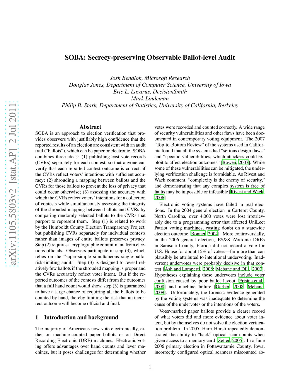 SOBA is an approach to election verification that provides observers with justifiably high confidence that the reported results of an election are consistent with an audit trail ("ballots"), which can be paper or electronic. SOBA combines three ideas: (1) publishing cast vote records (CVRs) separately for each contest, so that anyone can verify that each reported contest outcome is correct, if the CVRs reflect voters' intentions with sufficient accuracy; (2) shrouding a mapping between ballots and the CVRs for those ballots to prevent the loss of privacy that could occur otherwise; (3) assessing the accuracy with which the CVRs reflect voters' intentions for a collection of contests while simultaneously assessing the integrity of the shrouded mapping between ballots and CVRs by comparing randomly selected ballots to the CVRs that purport to represent them. Step (1) is related to work by the Humboldt County Election Transparency Project, but publishing CVRs separately for individual contests rather than images of entire ballots preserves privacy. Step (2) requires a cryptographic commitment from elections officials. Observers participate in step (3), which relies on the "super-simple simultaneous single-ballot risk-limiting audit." Step (3) is designed to reveal relatively few ballots if the shrouded mapping is proper and the CVRs accurately reflect voter intent. But if the reported outcomes of the contests differ from the outcomes that a full hand count would show, step (3) is guaranteed to have a large chance of requiring all the ballots to be counted by hand, thereby limiting the risk that an incorrect outcome will become official and final.