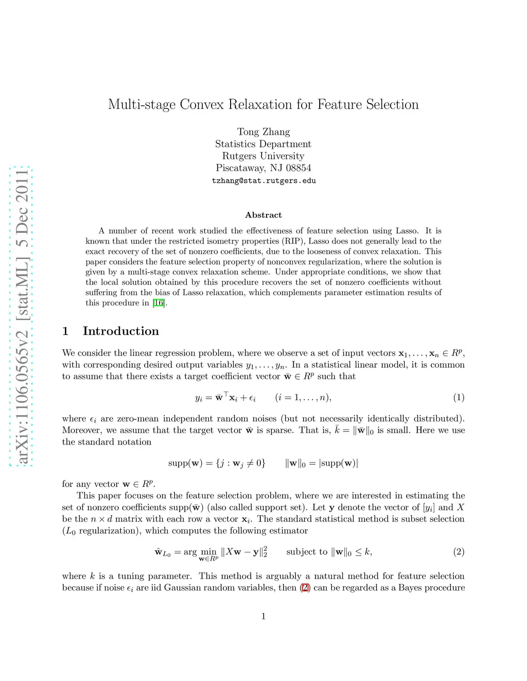 A number of recent work studied the effectiveness of feature selection using Lasso. It is known that under the restricted isometry properties (RIP), Lasso does not generally lead to the exact recovery of the set of nonzero coefficients, due to the looseness of convex relaxation. This paper considers the feature selection property of nonconvex regularization, where the solution is given by a multi-stage convex relaxation scheme. Under appropriate conditions, we show that the local solution obtained by this procedure recovers the set of nonzero coefficients without suffering from the bias of Lasso relaxation, which complements parameter estimation results of this procedure.