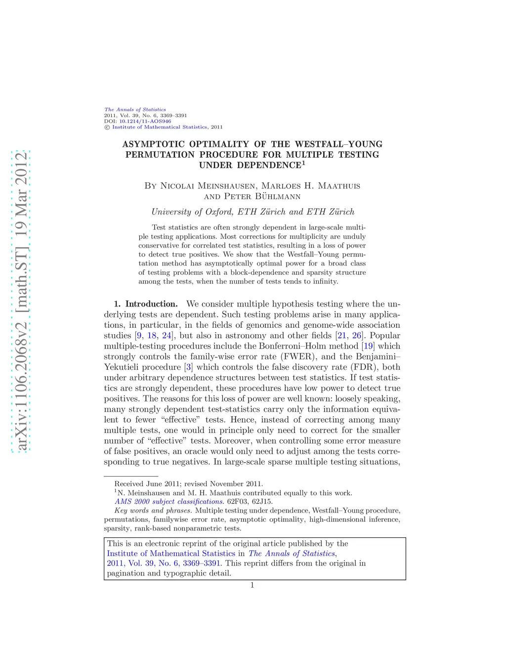 Test statistics are often strongly dependent in large-scale multiple testing applications. Most corrections for multiplicity are unduly conservative for correlated test statistics, resulting in a loss of power to detect true positives. We show that the Westfall-Young permutation method has asymptotically optimal power for a broad class of testing problems with a block-dependence and sparsity structure among the tests, when the number of tests tends to infinity.
