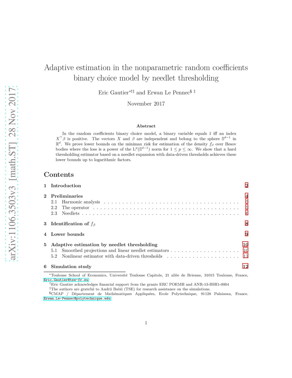 In the random coefficients binary choice model, a binary variable equals 1 iff an index is positive.The vectors and are independent and belong to the sphere in .We prove lower bounds on the minimax risk for estimation of the density over Besov bodies where the loss is a power of the norm for . We show that a hard thresholding estimator based on a needlet expansion with data-driven thresholds achieves these lower bounds up to logarithmic factors.