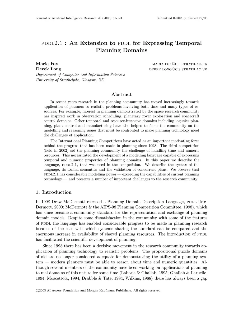 PDDL2.1: An Extension to PDDL for Expressing Temporal Planning Domains